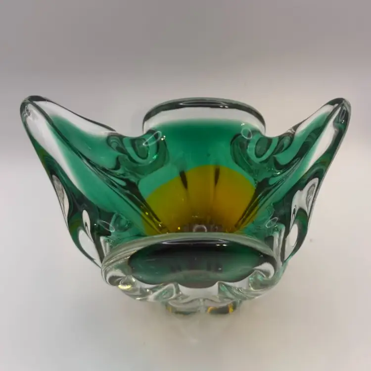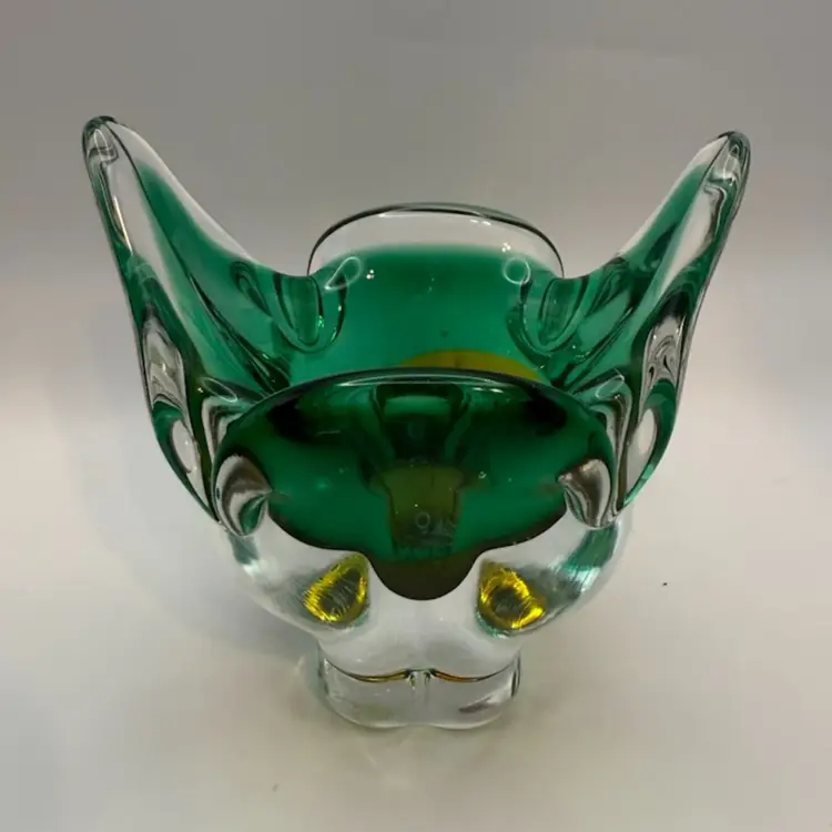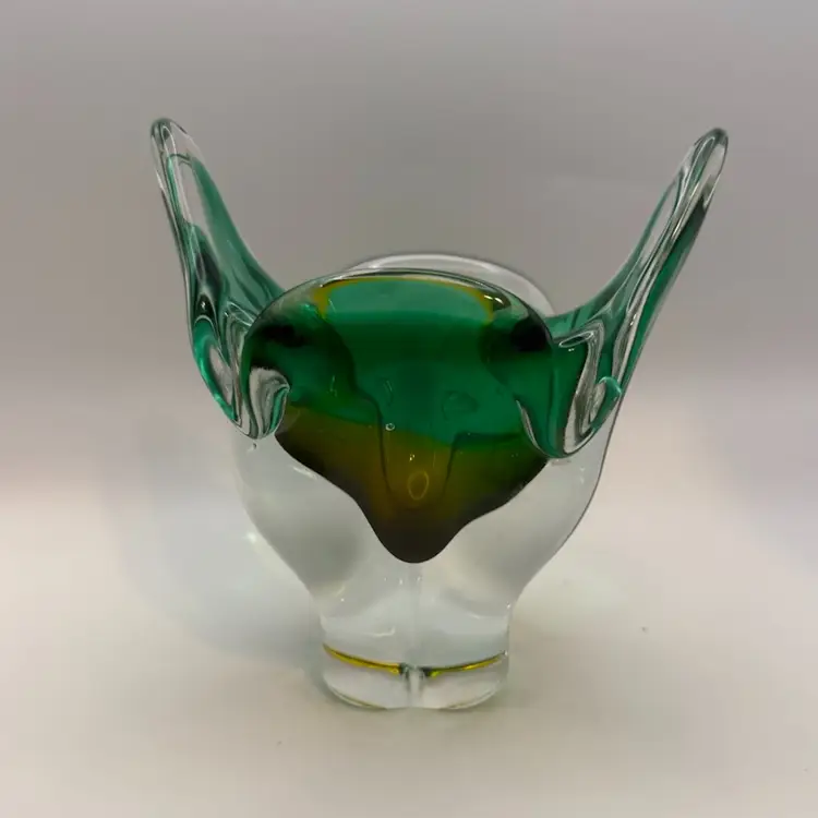 vintage Chřibská art glass vase, likely designed by Josef Hospodka. This particular vase is identified as model number 296/4/13 from the Chřibská glassworks in Czechoslovakia. It features a striking combination of green and yellow glass encased in clear glass, showcasing the "sommerso" technique. Josef Hospodka is known for his organic, sculptural designs for Chřibská, and this model remained in production until the factory closed. The vase measures approximately 5 inches tall by 4.5 inches in diameter at its widest point.