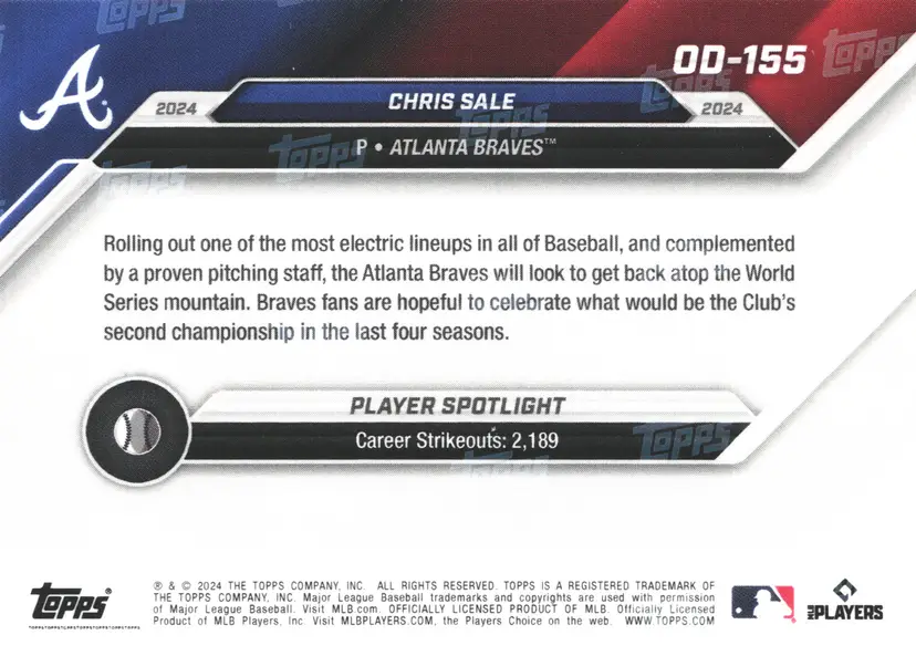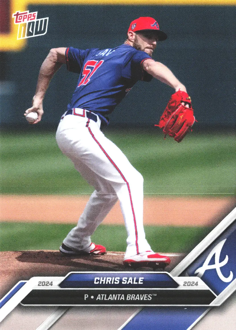 1st time buyer? Get $5 Off with code DISTRICT5 at checkout! Card as shown. All cards $20 and under ship PWE via lettertrackpro [https://www.letter-track.com/registerap.asp?AFID=8757] Sport: Baseball Set: 2024 Topps Now Road to Opening Day Card Name: Chris Sale - Atlanta Braves Card Number: OD-155 Player/Athlete: Chris Sale Team: Atlanta Braves