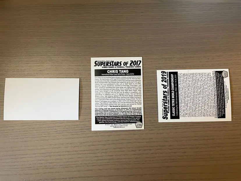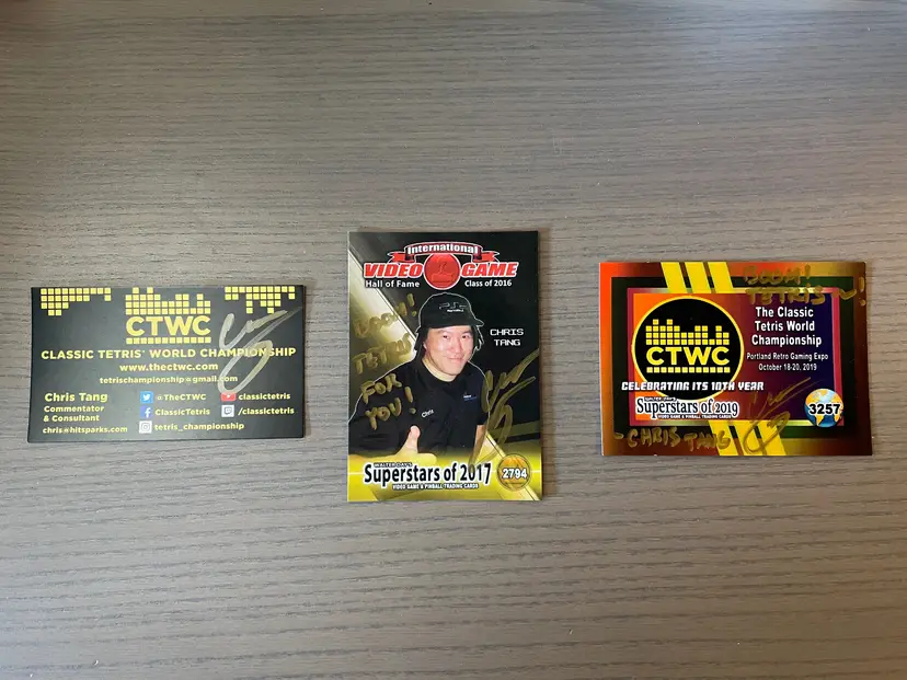 Three collectible cards, all signed by CTWC Commentator Chris Tang! First is a signed CTWC business card. Second is a signed Walter Day's Superstars of 2017 card. Third is a signed Walter Day's Superstars of 2019 card. Chris Tang gave these to Chris Higgins in 2021 during the recording session for the Best of Five game commentary in California. They all are signed in gold Sharpie. SEE PHOTOS for details.