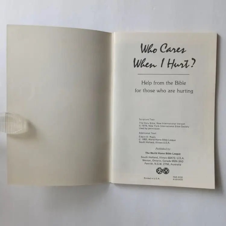 Christian Booklet "Who Cares When I Hurt" by E. D. Roels from The World Home Bible League, published in Weston, Ontario in 1983. This vintage first edition self-help book, written in English, is aimed at young adults and adults seeking guidance and comfort through Bible teachings on God's help. With 48 pages in a paperback format, this enlightening booklet is a valuable resource for those looking for spiritual support and encouragement.