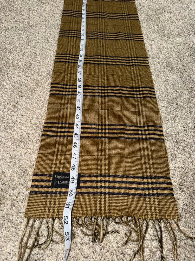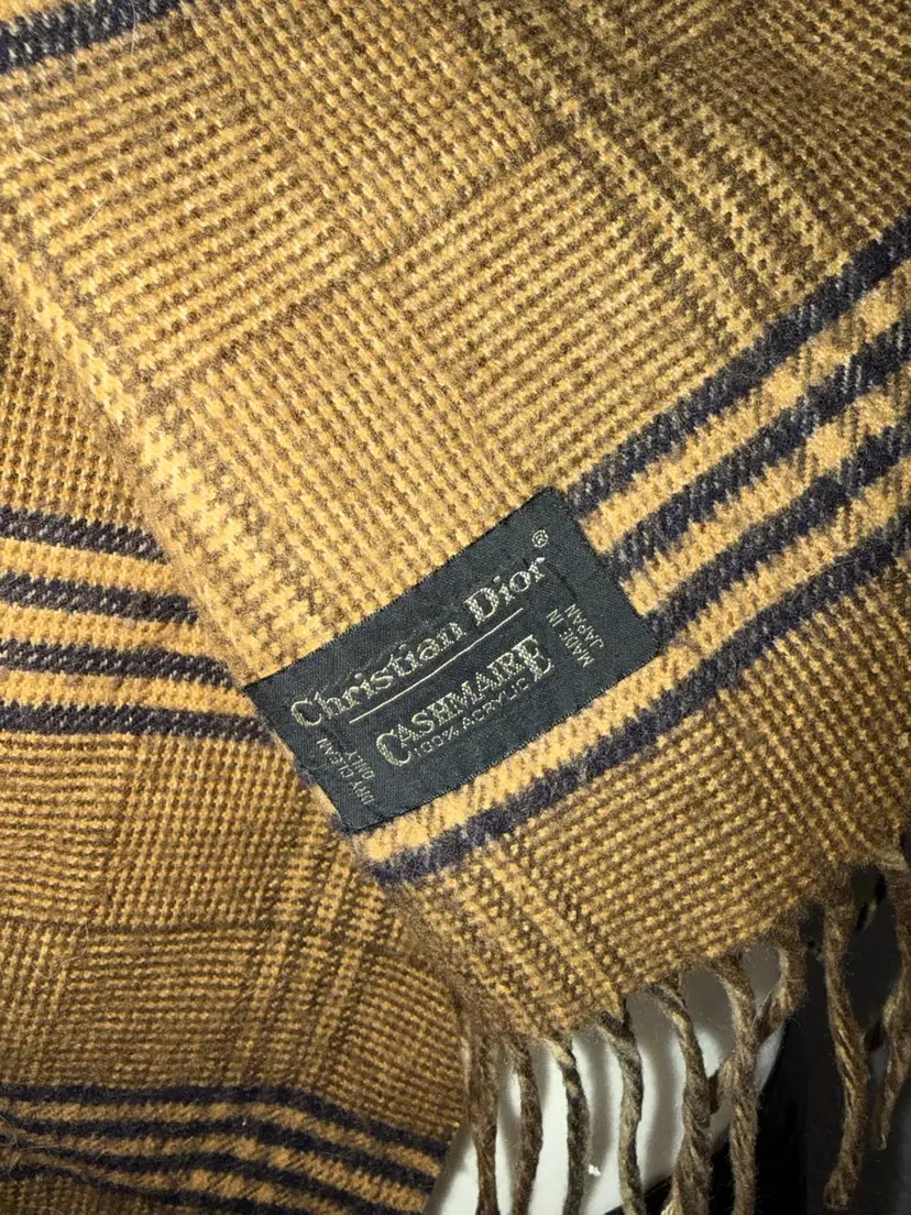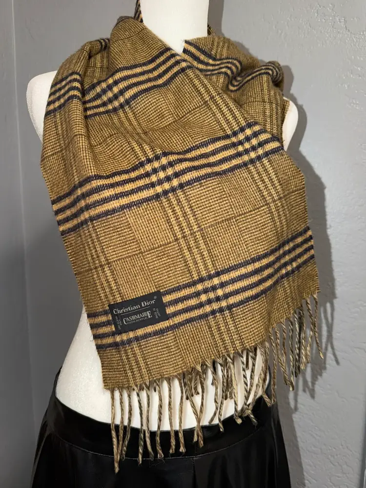 This Christian Dior Vintage Cashmaire Scarf is a luxurious accessory for women, featuring a classic brown plaid pattern with fringe accents. Made from acrylic material, this 53" rectangle scarf is perfect for the winter, fall, and spring seasons. The vintage design adds a touch of elegance to any outfit, making it a stylish and timeless addition to your wardrobe. Ideal for keeping warm and fashionable, this Dior scarf is a must-have for those who appreciate classic and high-quality accessories.