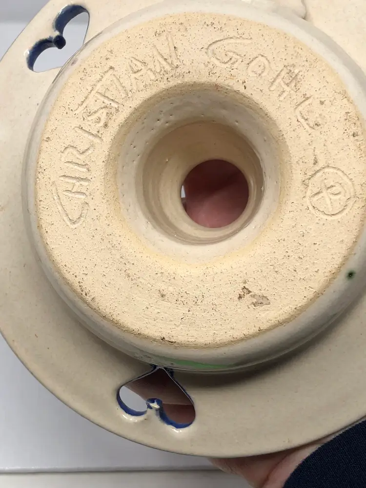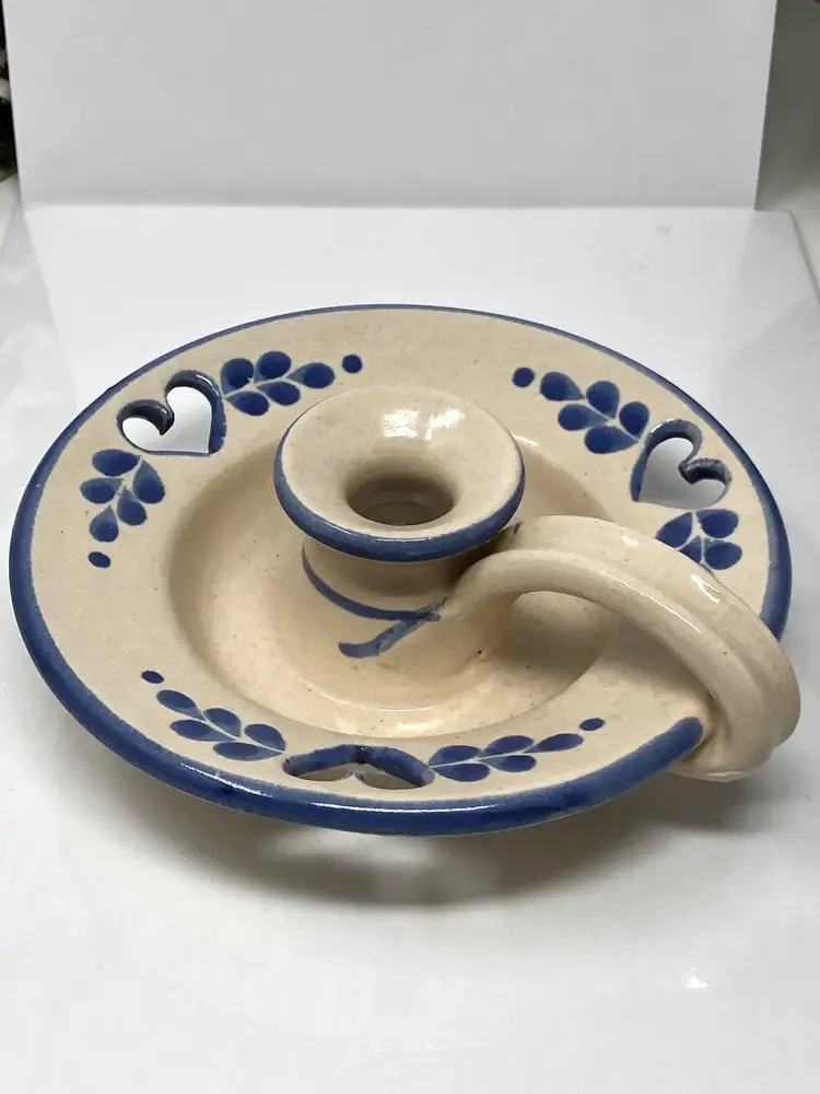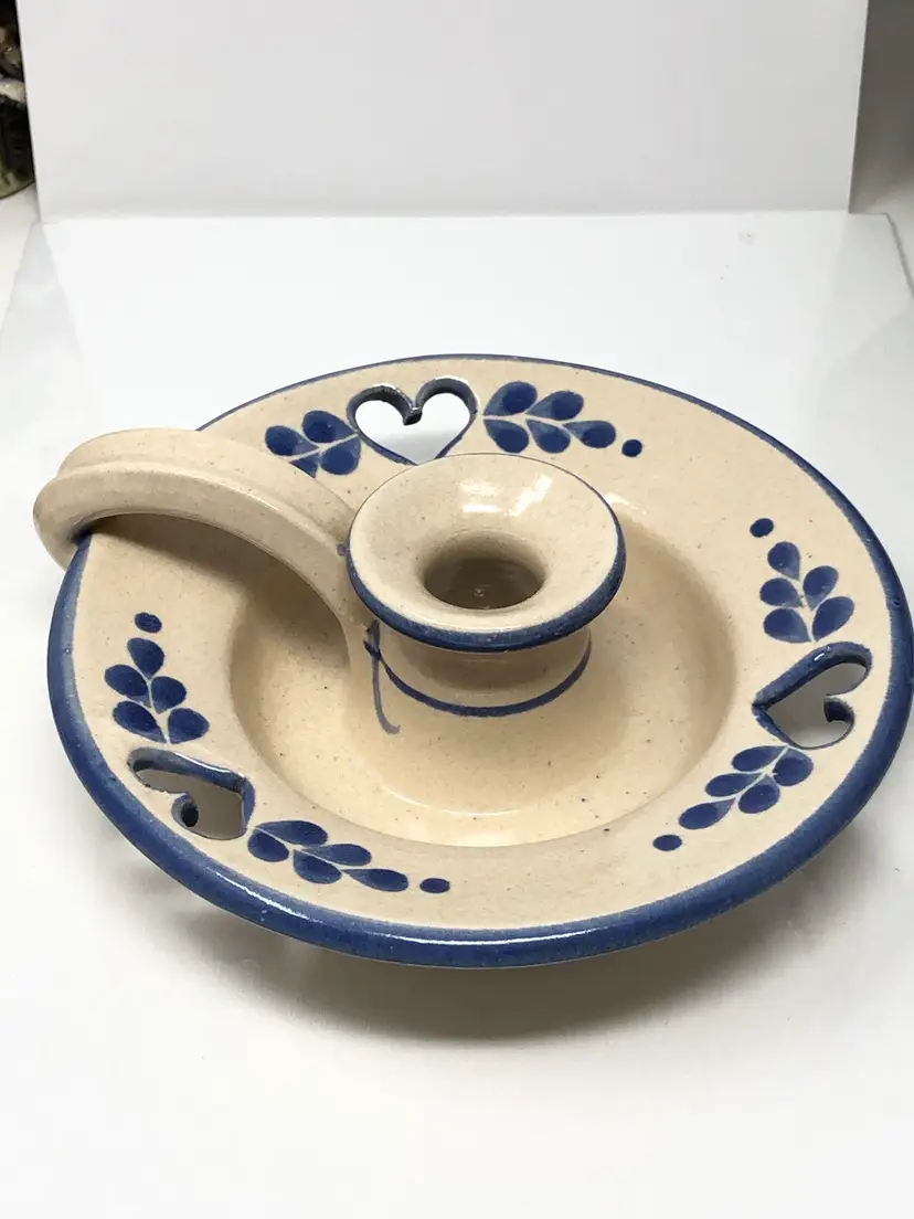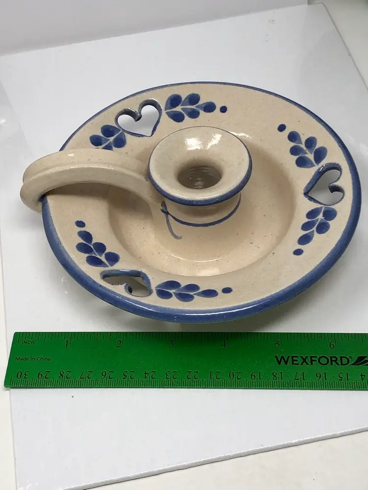 6 1/2" round signed pottery candlestick holder with heart cut-outs. No chips or cracks.