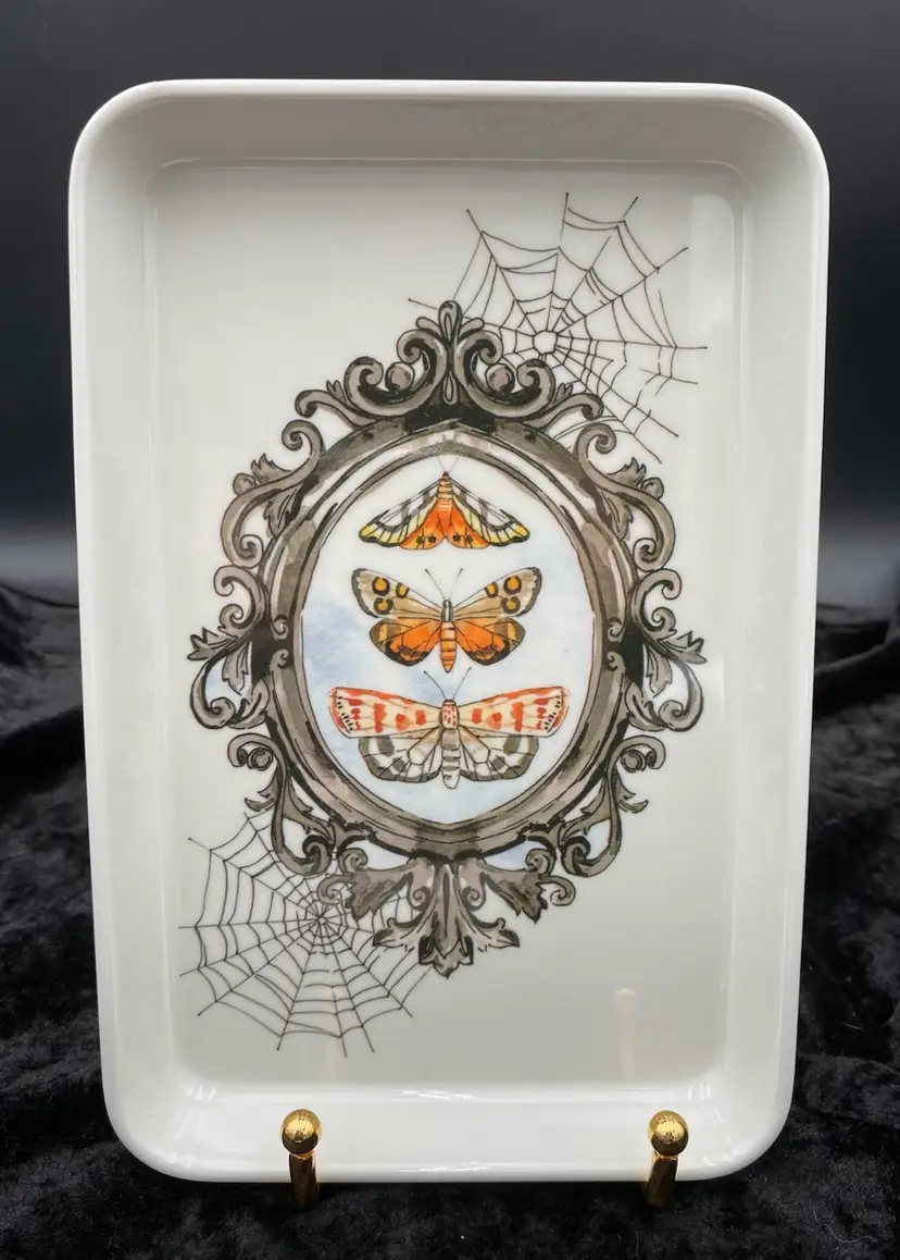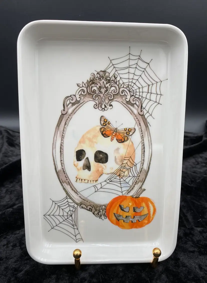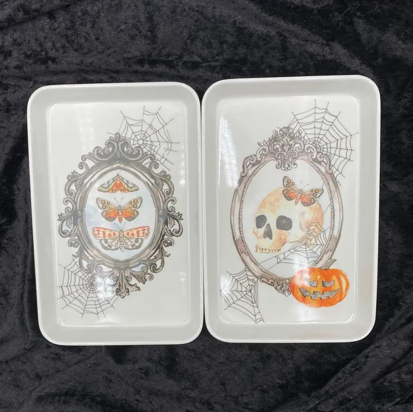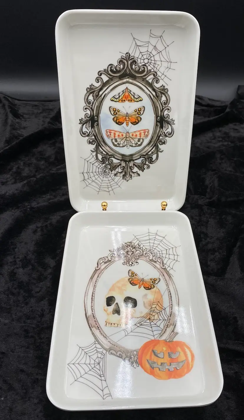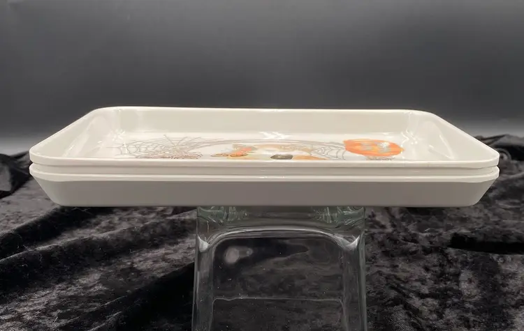 Elevate your Halloween gatherings with these Christian Siriano Spooky Halloween Melamine Appetizer Plates/Small Trays. This set of two rectangular plates, each measuring 8.5 inches in length and 5.5 inches in width, is perfect for serving appetizers and snacks during the festive season. With a .5-inch height, these plates are a practical choice for any Halloween-themed event. Crafted from durable melamine, these plates are designed to withstand the excitement of the holiday. They feature a shiny finish and boast a modern, chic style that complements the spooky Halloween pattern. Lightweight yet resilient, they are break and chip resistant and can be conveniently cleaned in a dishwasher.