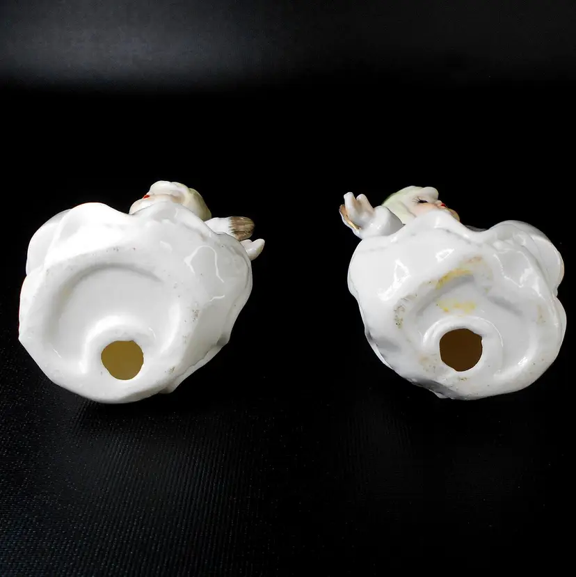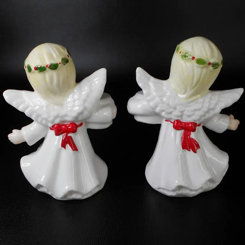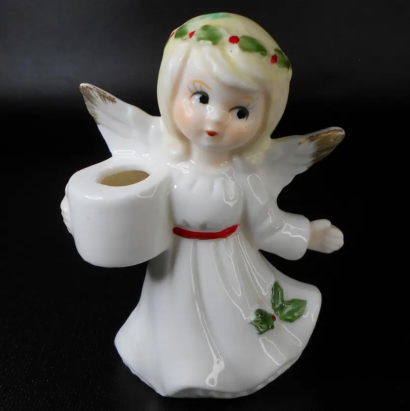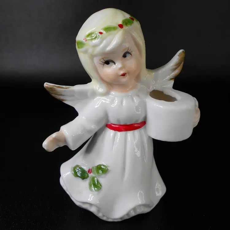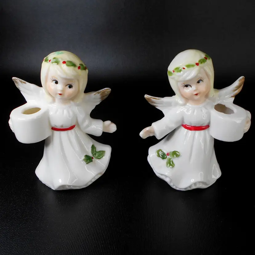 Mid Century angel girl candle holder pair. Holds small taper candlesticks. Measures 4" tall. Green marks on one angel's head.