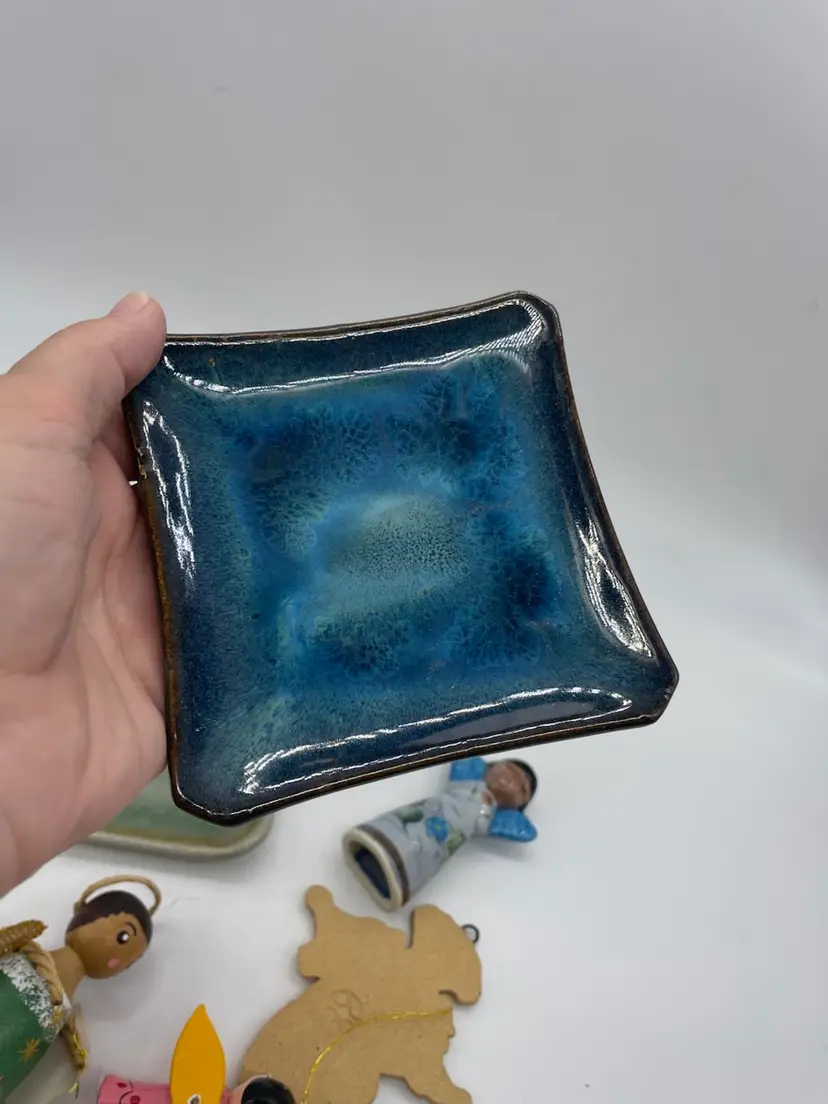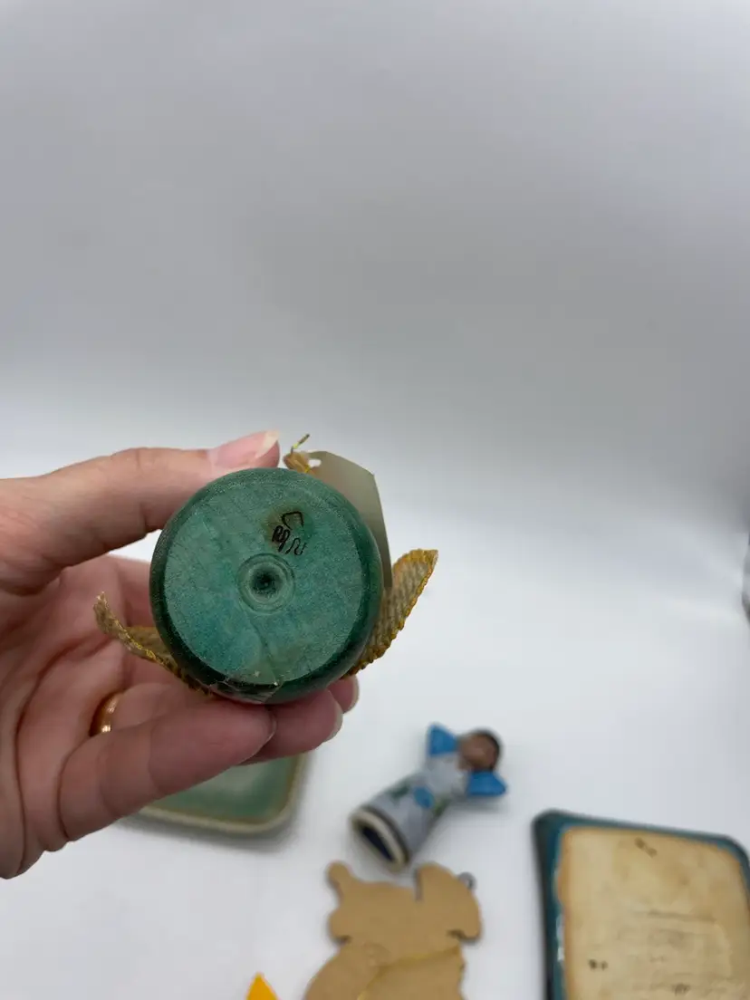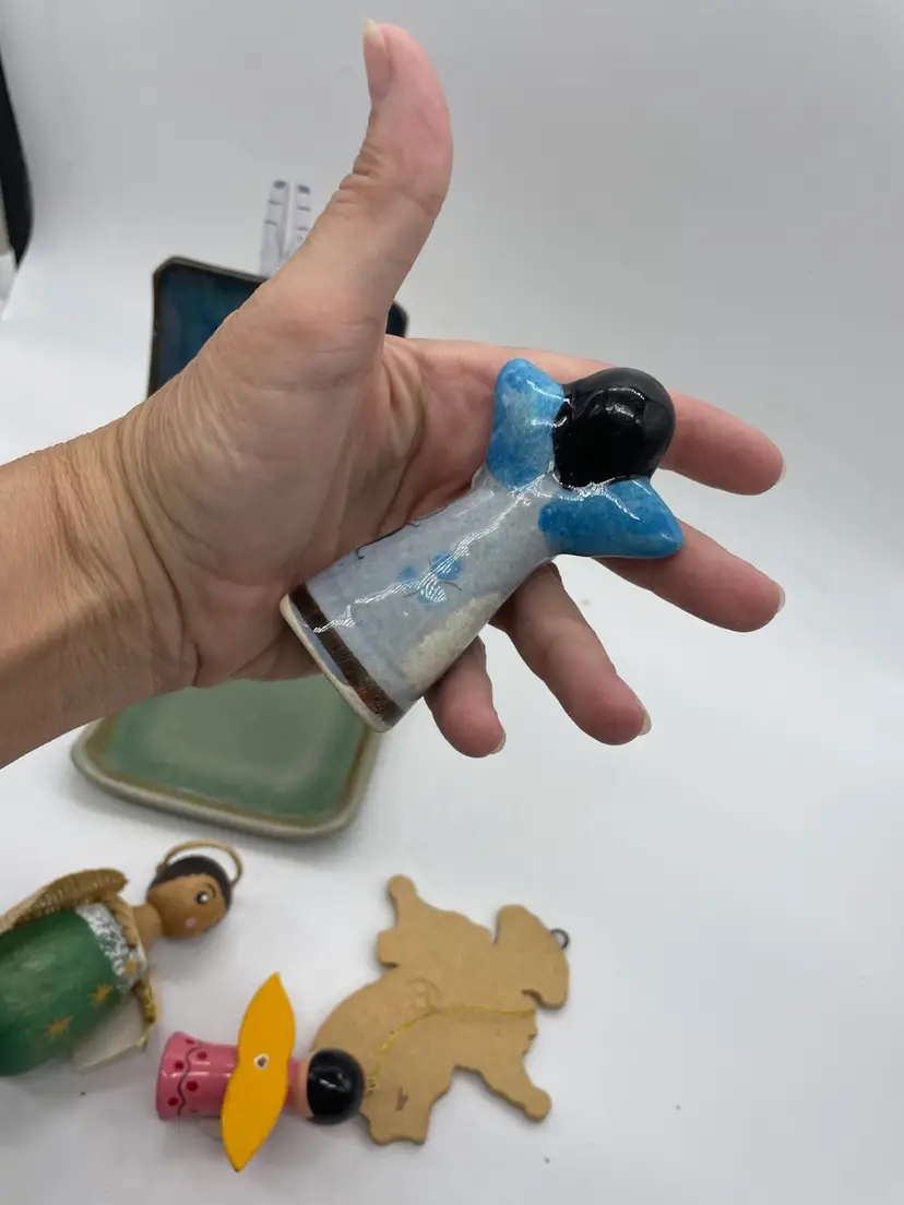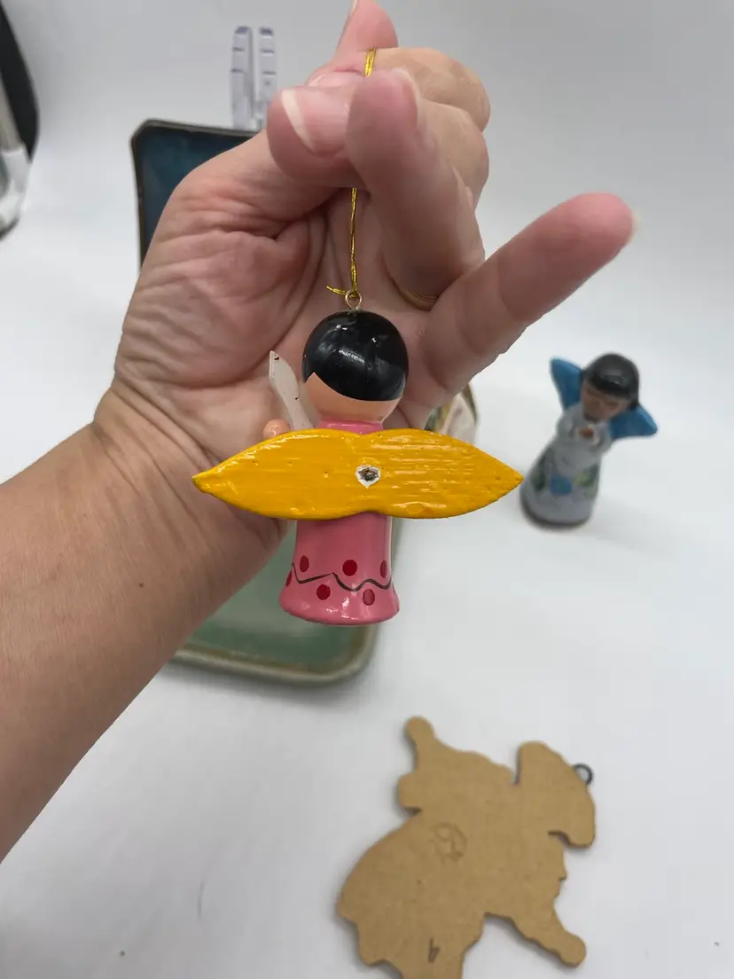 Wood angel ornament, ceramic angel figurine – blue, pottery, angel with baby ornament – needs ribbon, wood and burlap angel – has tag. Two square trinket dishes – blue and green.