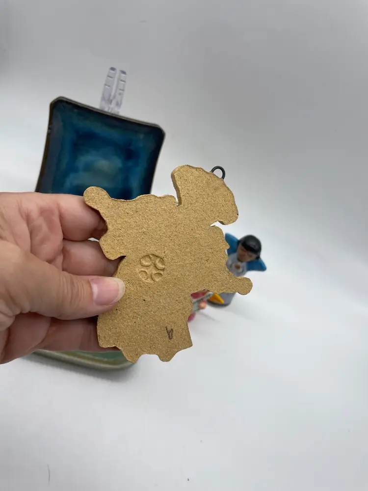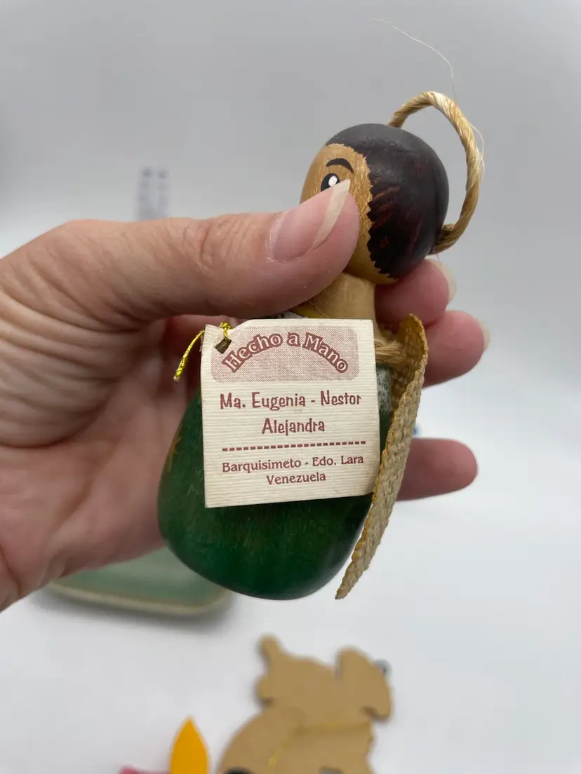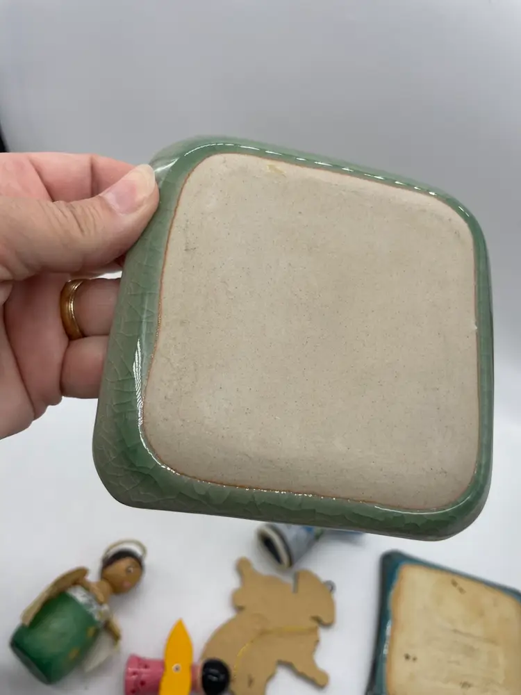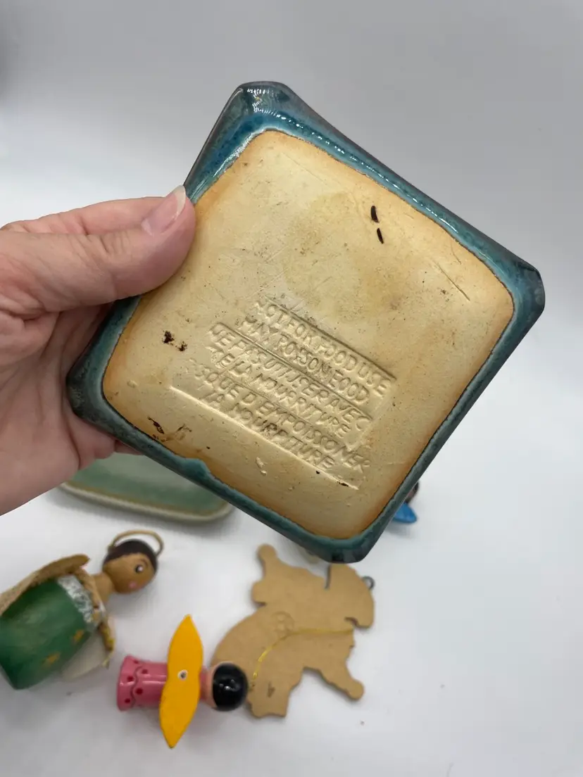Wood angel ornament, ceramic angel figurine – blue, pottery, angel with baby ornament – needs ribbon, wood and burlap angel – has tag. Two square trinket dishes – blue and green.