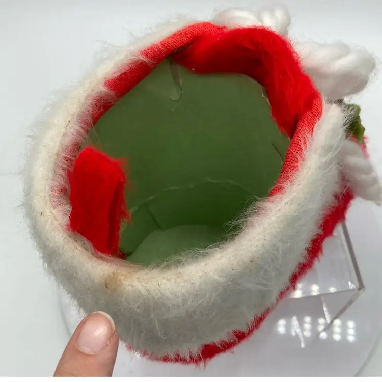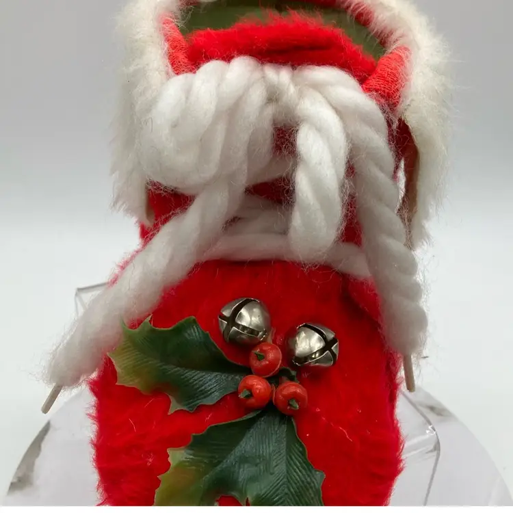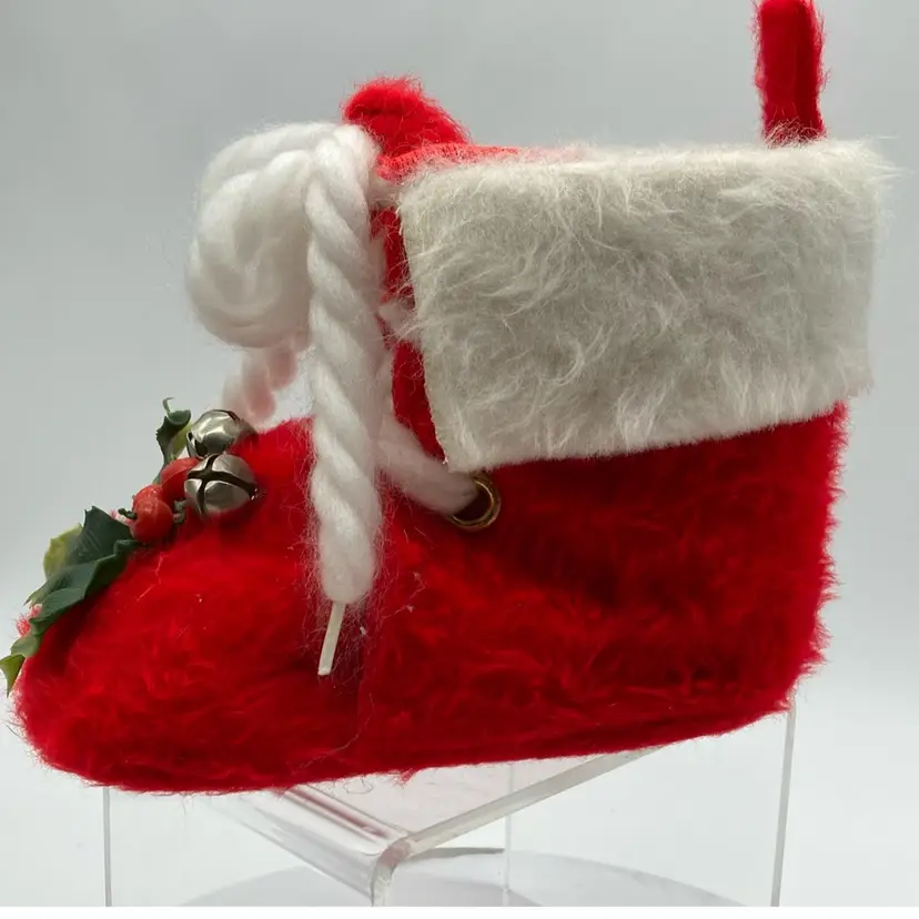 So vintage! Brings me right back to the good old Christmas days. ππ Bright red faux fur, plastic holly, twisted tie laces. Made of paperboard. 8βx 5βx 6βH One stain, as pictured.