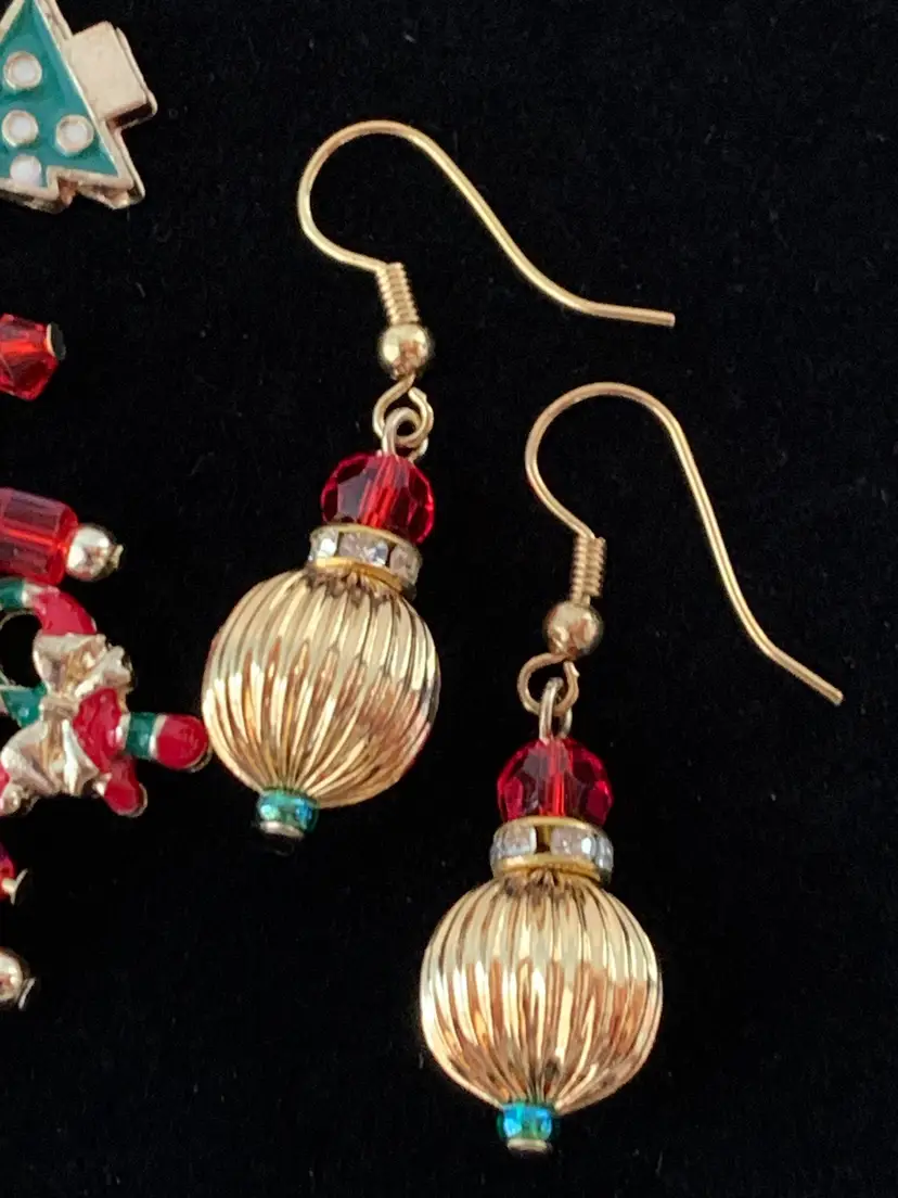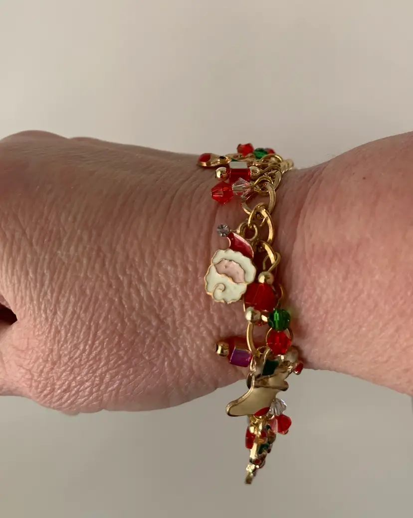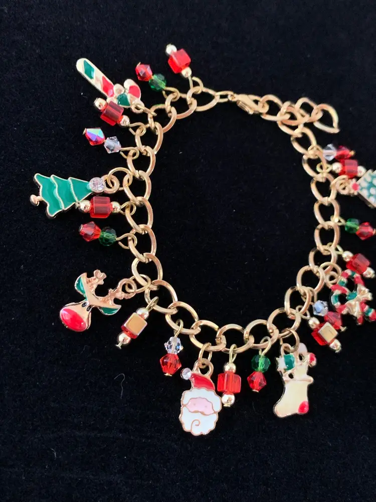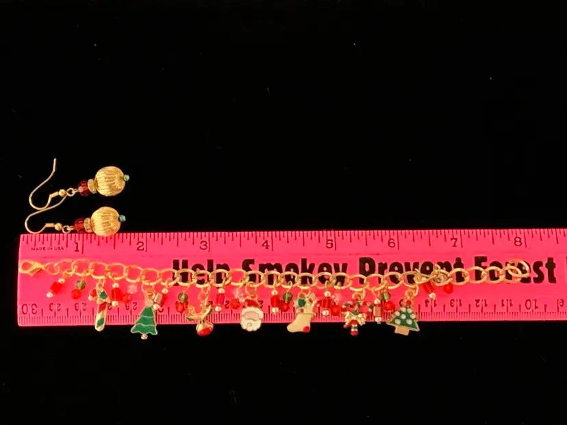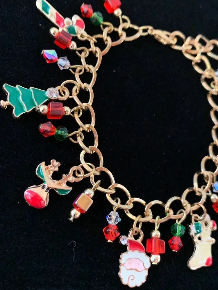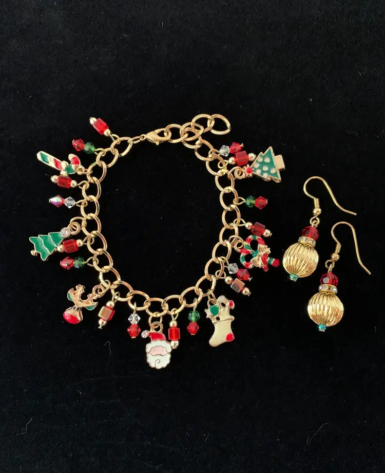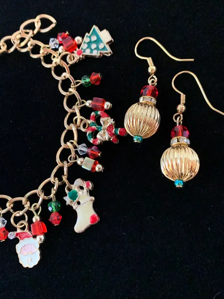 Gold toned bracelet has Christmas charms and red and green glass bead dangles. Matching earrings are made from vintage brass beads, glass beads and rhinestone spacer beads on fishhook style earrings wires. Bracelet is 8” in length and earrings are an inch and half in length. Lightweight and easy to wear.