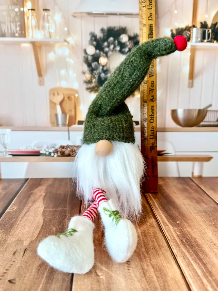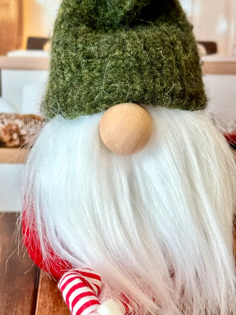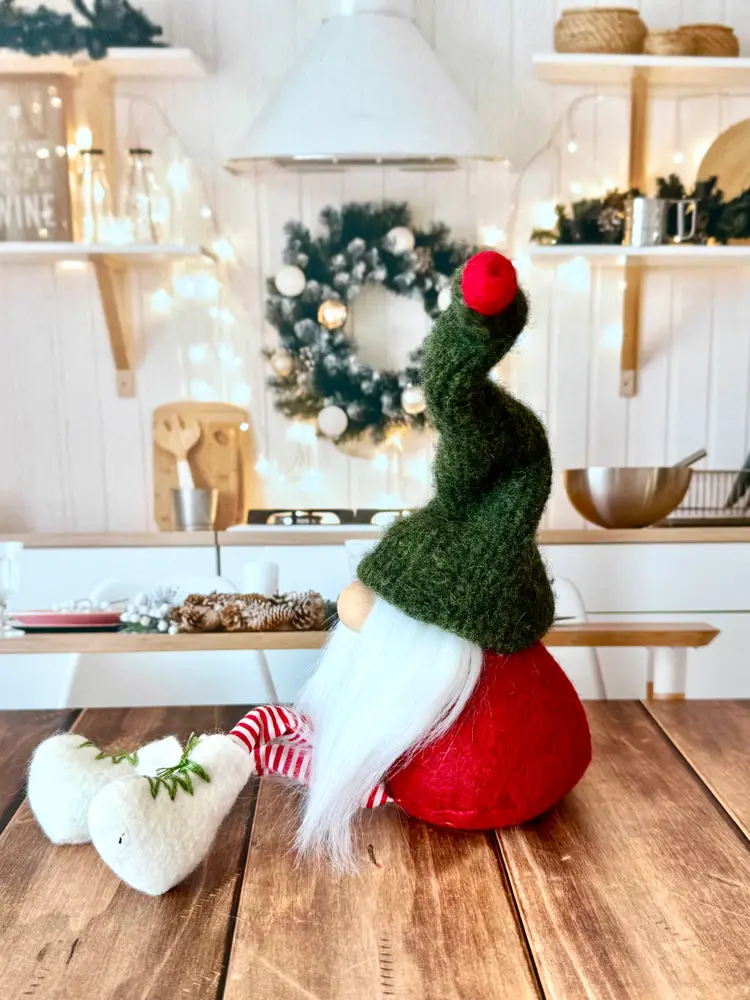This cute gnome is red and green. The hat is one of a kind made from an upycled sweater topped with a red pom pom. The body is red felt and the legs are red and white stripe fabric. The cute handmade white felt shoes are tied up with a green floss. A big wooden nose gives him a lot of personality!