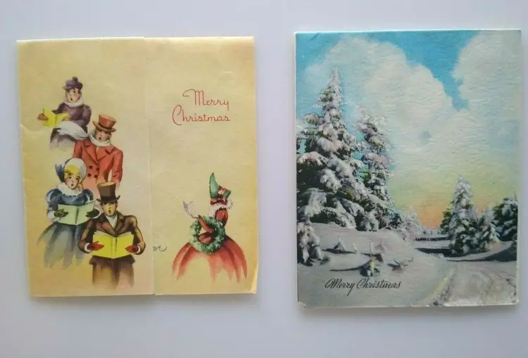 Vintage original used greeting cards. Lot of (2) used with writing and age wear. Small nibble to corner on one. Size is 4"-5". Stock #gc21.
