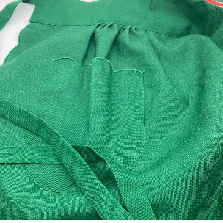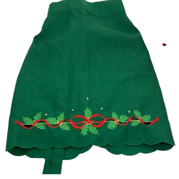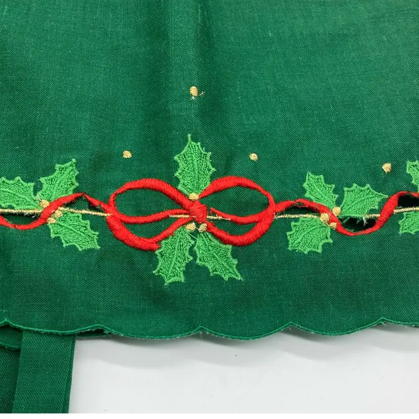 So sweet to wear while hosting your holiday party or for adding to your apron collection. Scalloped edge, embroidered holly and bow design with cutouts, single pocket. Linen polyester blend is machine washable.