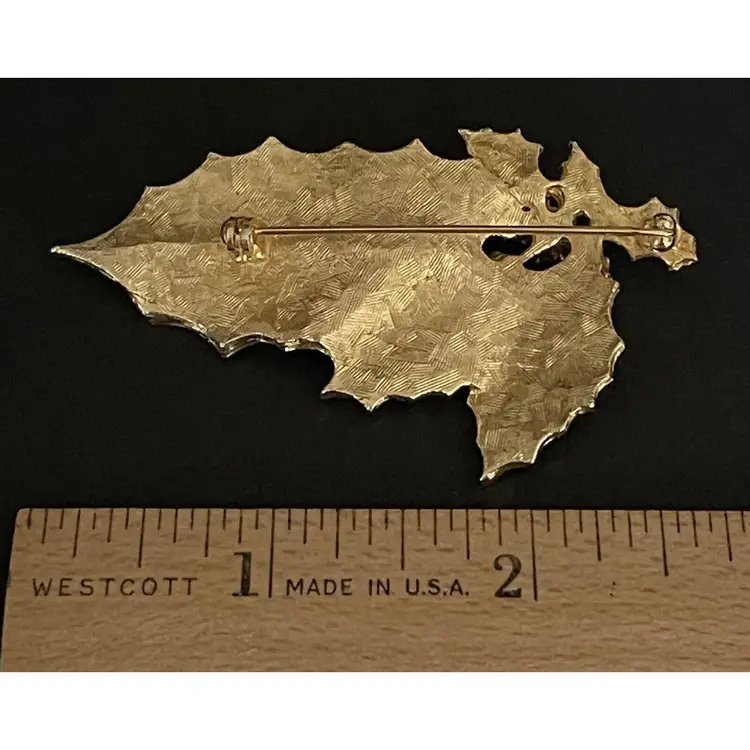 This is a VINTAGE HOLLY LEAF TEXTURED GOLD TONE BROOCH. It has clear rhinestones as berries.