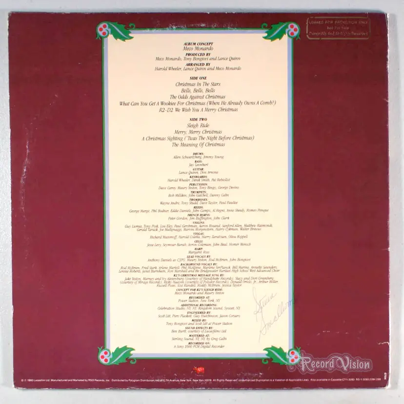 Christmas in the Stars: Star Wars Christmas Album features recordings of Star Wars-themed Christmas songs and stories about a droid factory where the robots make toys year-round for "S. Claus". Much of the album is sung and narrated by British actor Anthony Daniels, reprising his role as C-3PO from the Star Wars films. Sound designer Ben Burtt also provided sound effects for R2-D2 and Chewbacca. The album was produced by Meco Monardo (who had previously recorded Star Wars and Other Galactic Funk), with the hope that this would be the first in a series of annual Star Wars Christmas albums. The album is notable for featuring the first professional recording of Jon Bon Jovi (credited as "John Bongiovi", his birth name), who sang lead vocals on the song R2-D2 We Wish You a Merry Christmas. Due to the success of the album, the studios were ready to do a second printing. But before the second record printing could be done, RSO Records shut down.