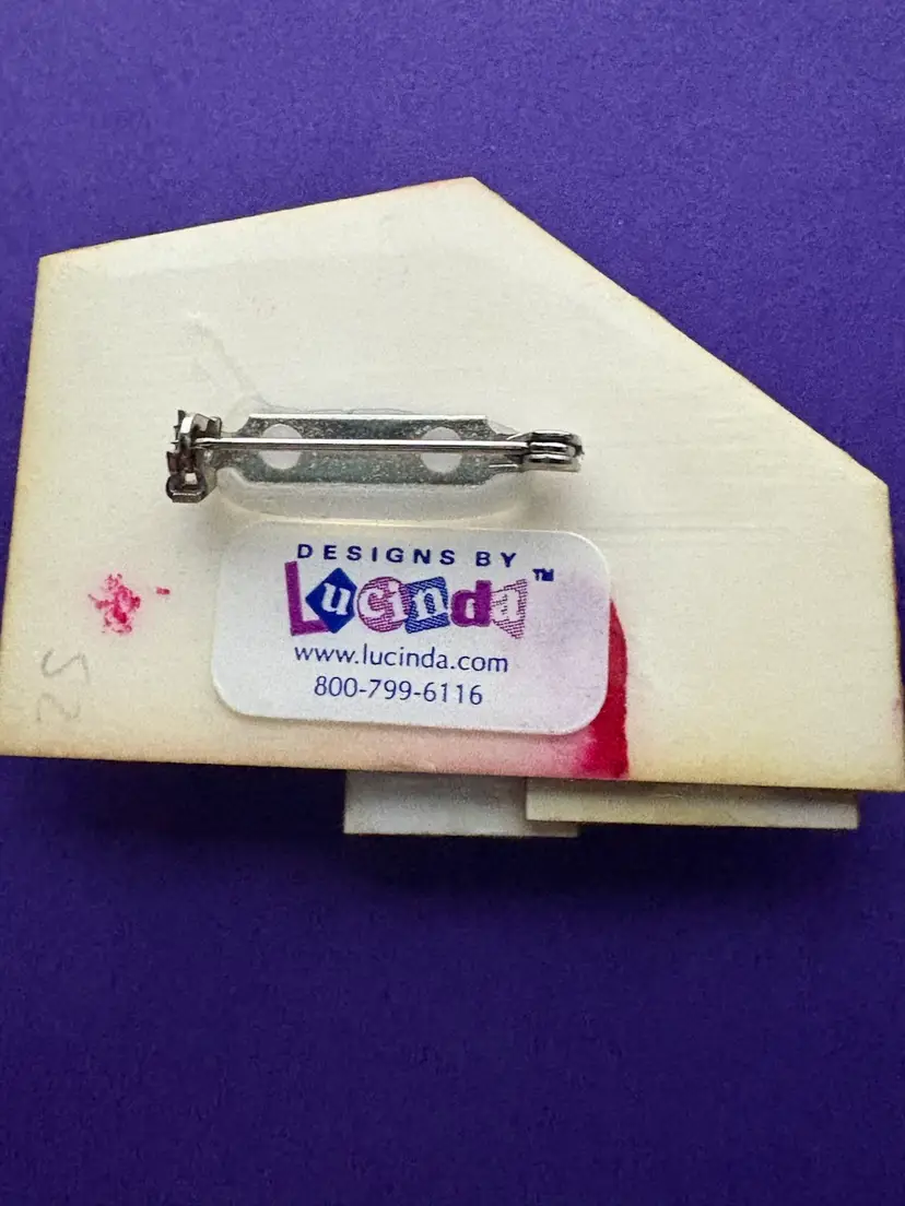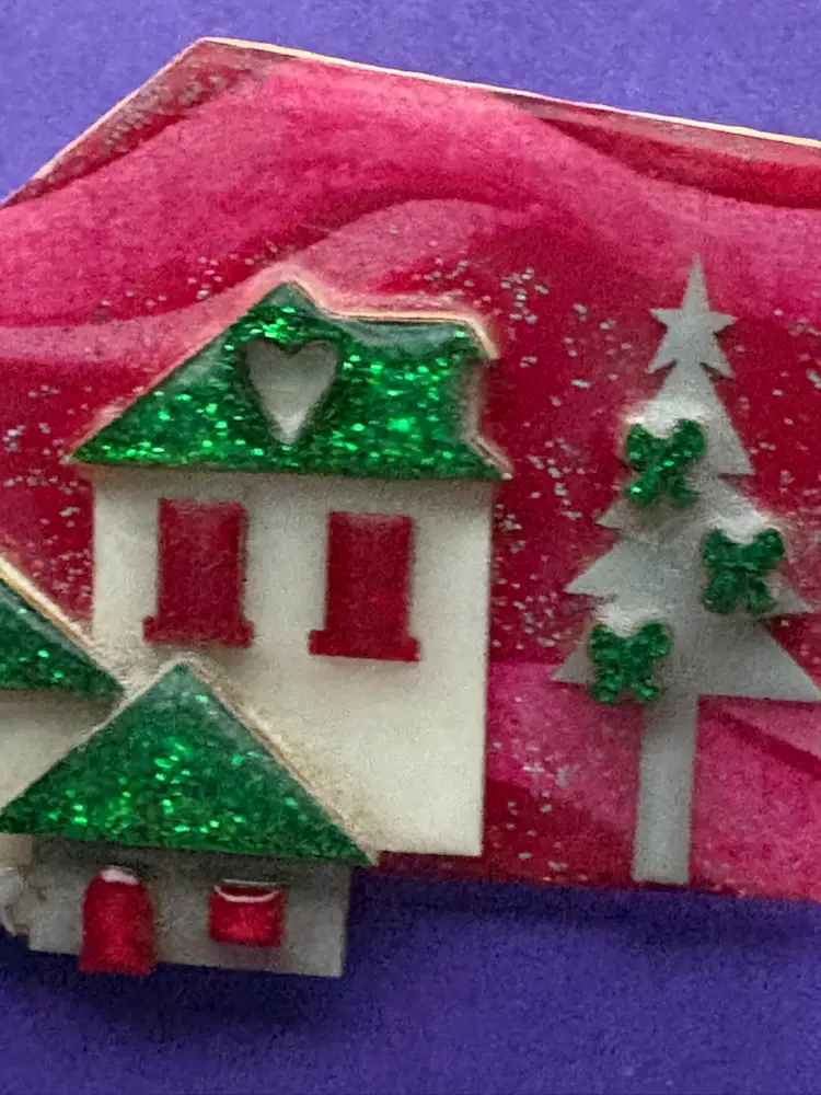 Rare and beautiful Designs by Lucinda pin / brooch includes a red and pink swirled sky with a hint of glitter. Has a Christmas tree decorated with green glitter bows and there is a ski pole leaning on the house. Has the ‘Designs by Lucinda’ sticker on the back.