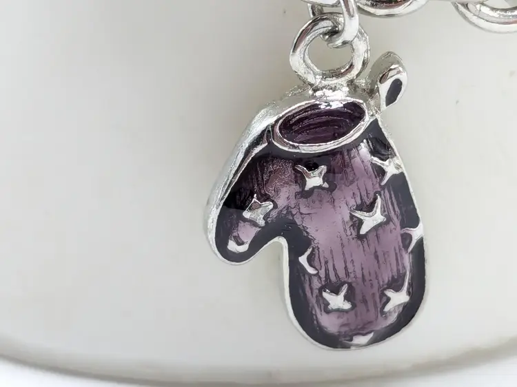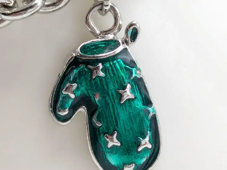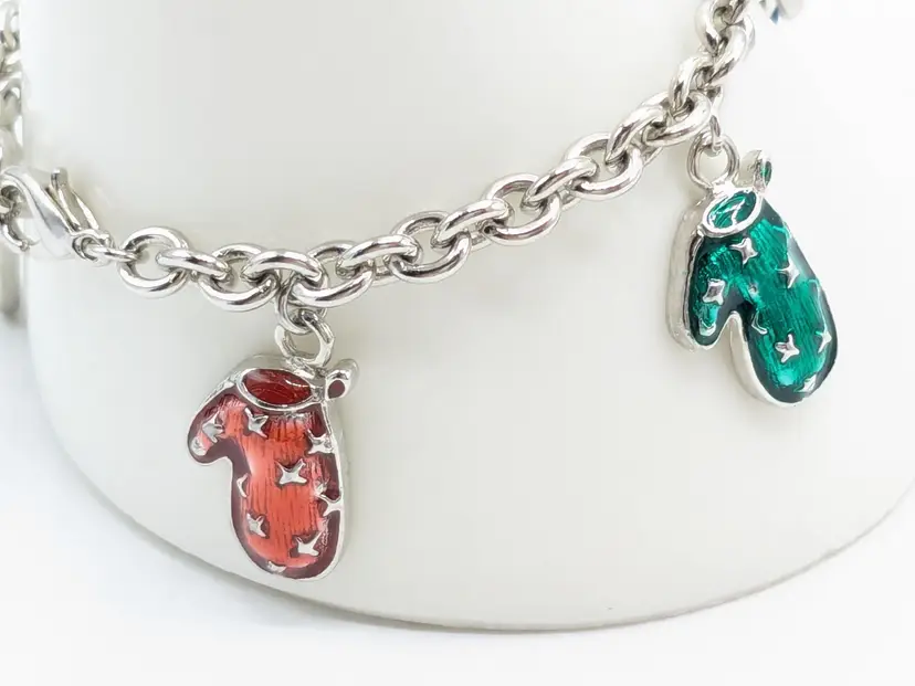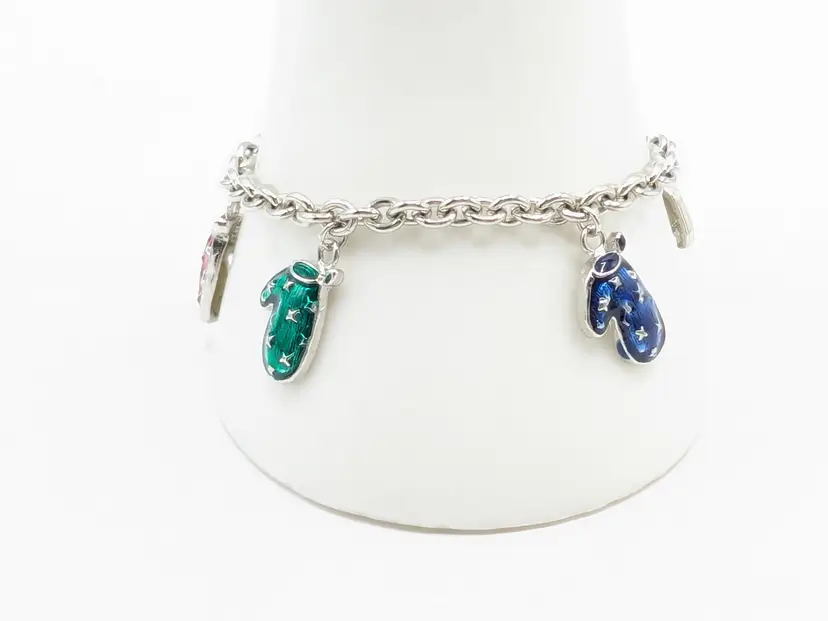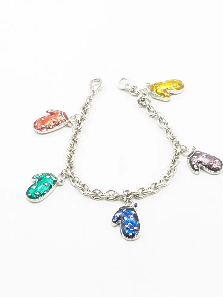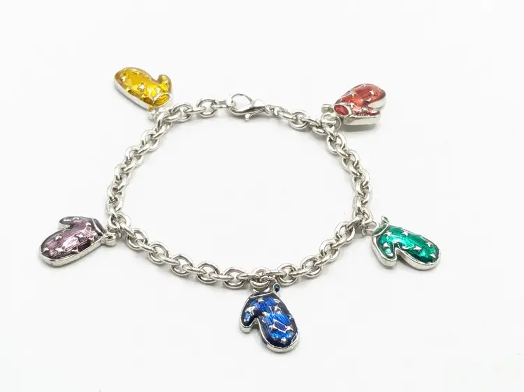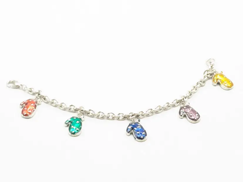 Good condition. Features five colorful enamel mitten charms on a silver-tone chain. Each mitten is uniquely colored: yellow, purple, blue, green, and red. Measures 7 inches in length. (EN1)