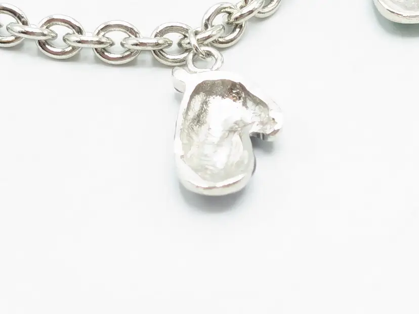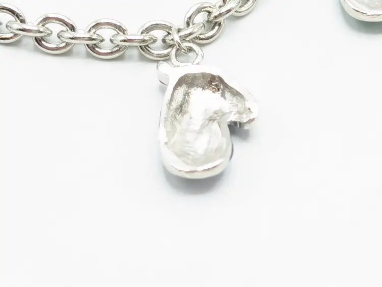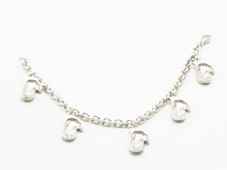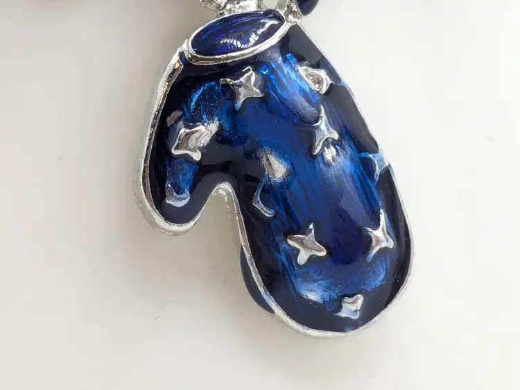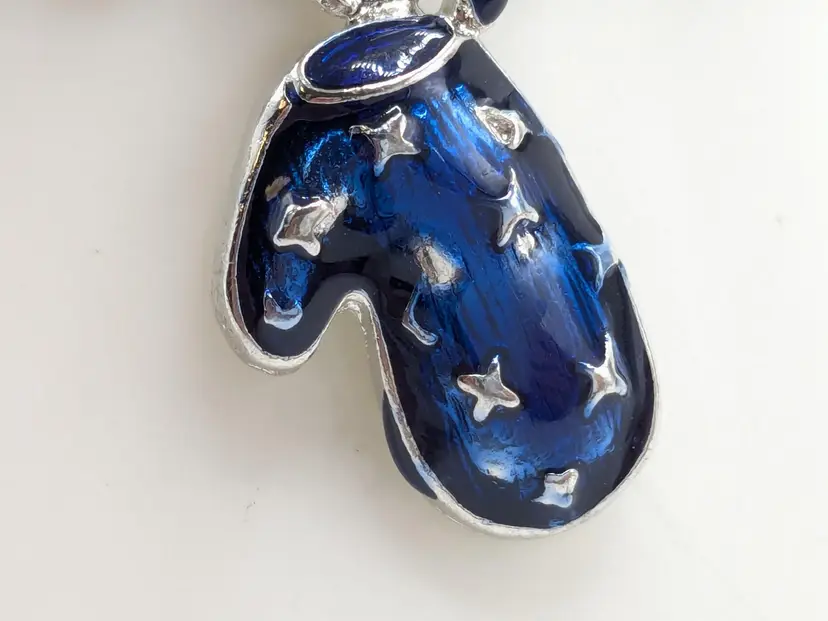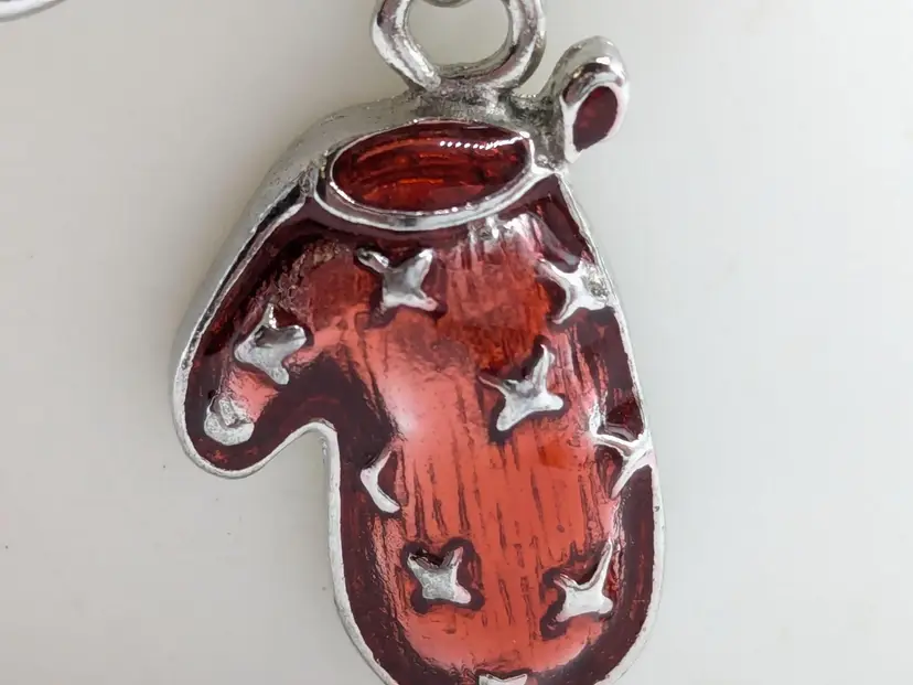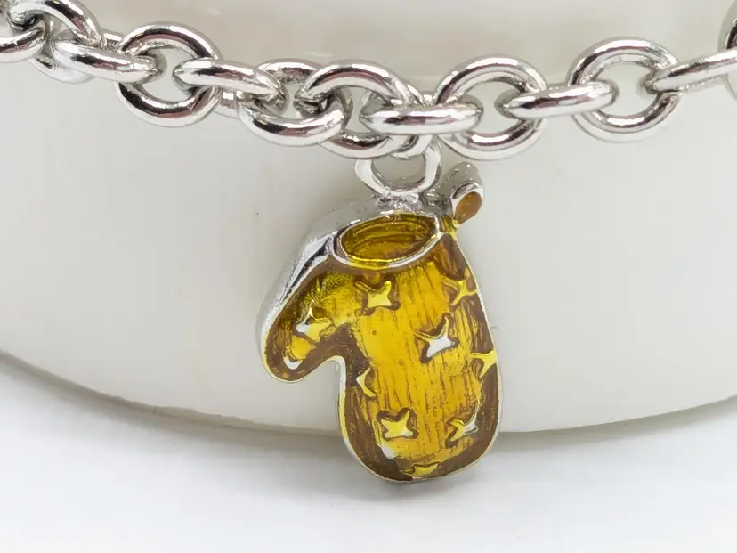 Good condition. Features five colorful enamel mitten charms on a silver-tone chain. Each mitten is uniquely colored: yellow, purple, blue, green, and red. Measures 7 inches in length. (EN1)