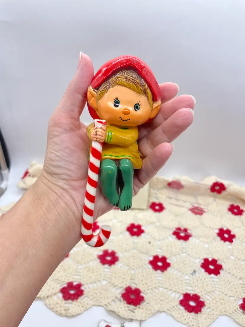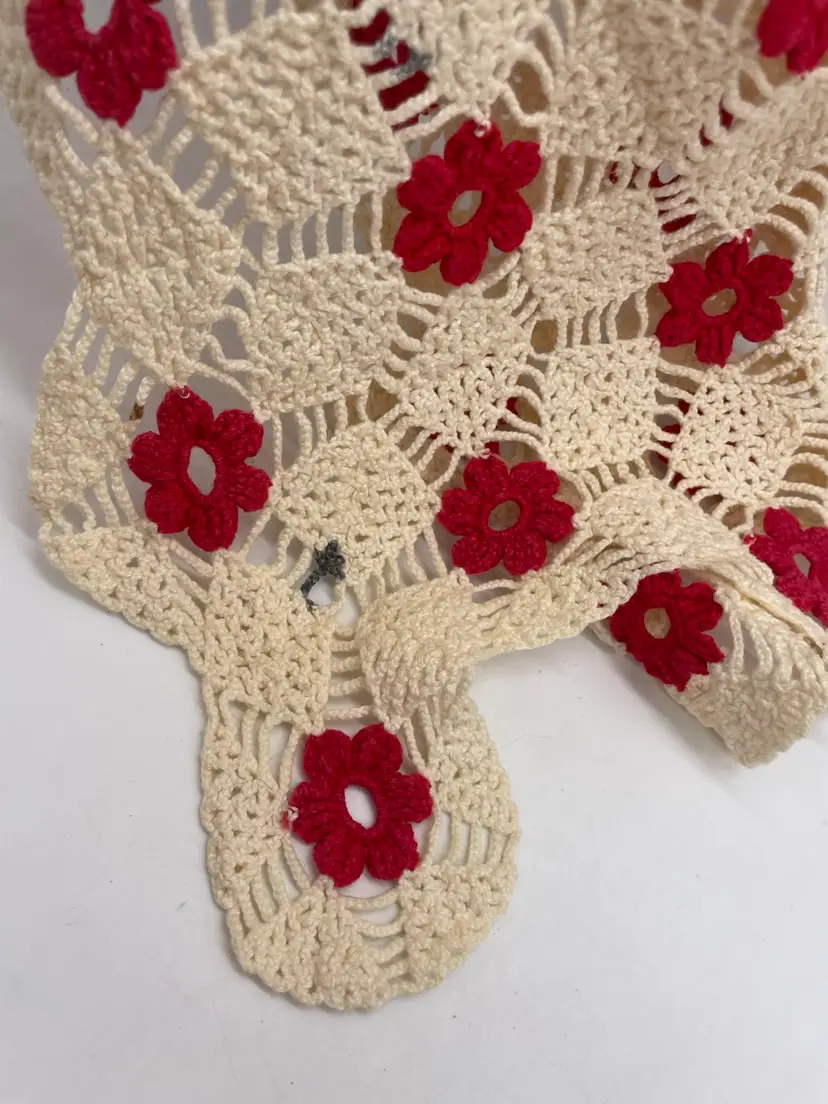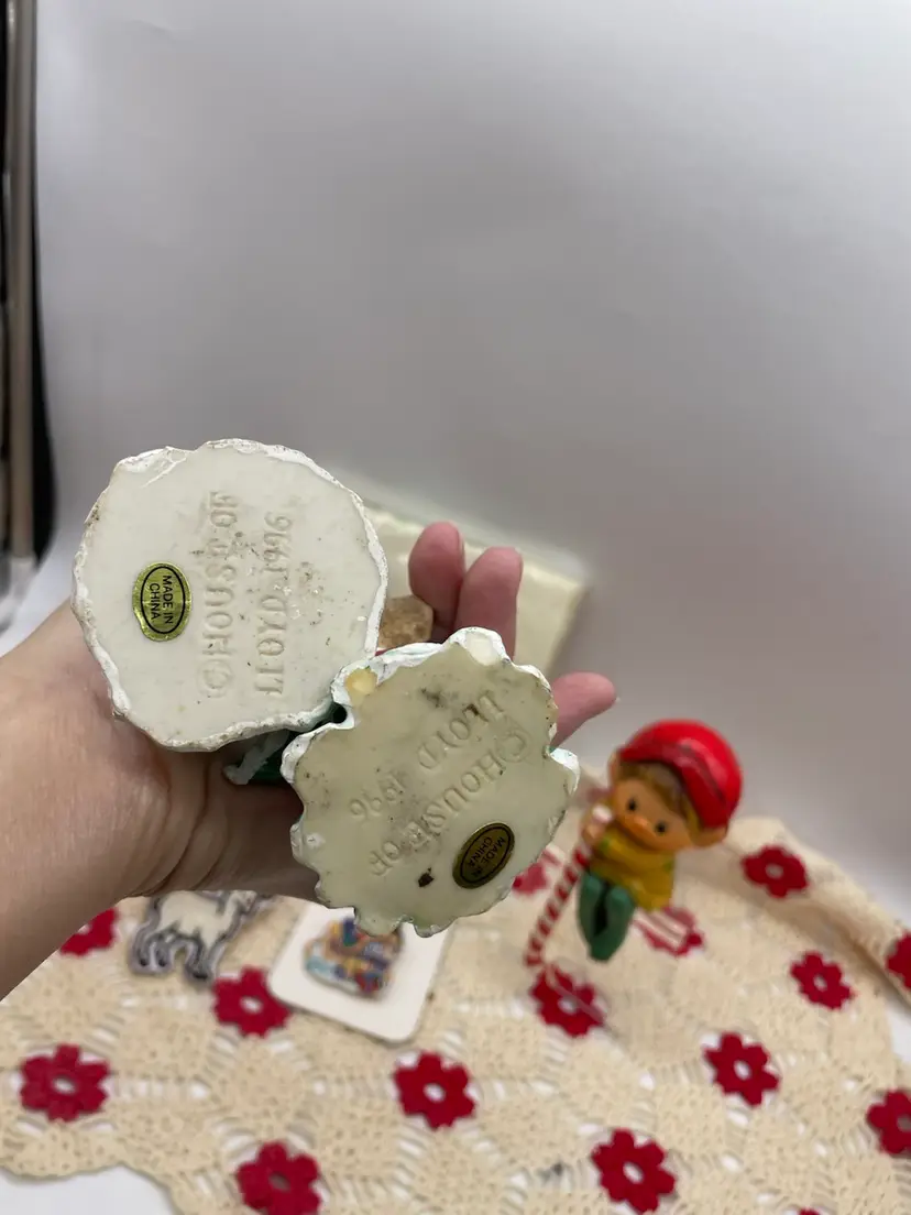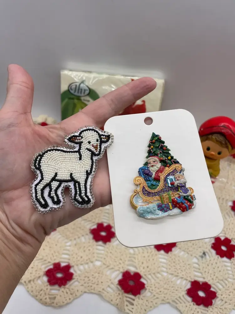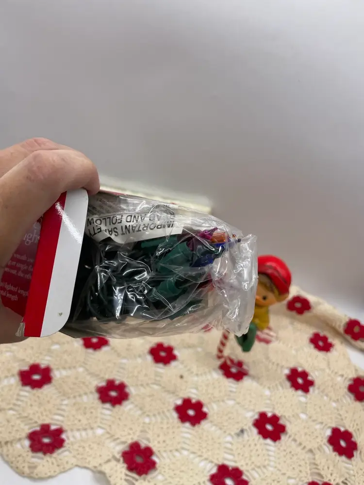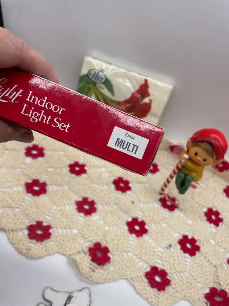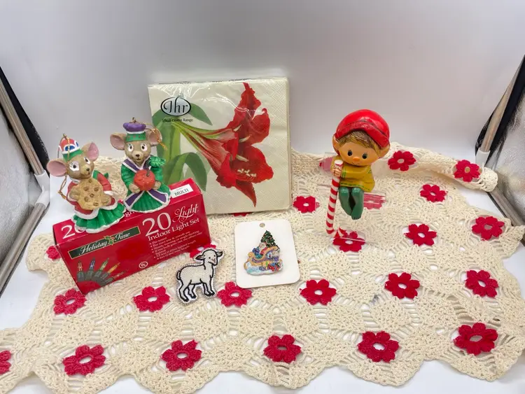 Crocheted dresser doily 24”X 14” - minor condition issues.. Home range, red beauty flower on cream napkin x 20 – made in Germany. House of Lloyd 1996 two mice/Wiseman ornaments. Elf with candy cane hallmark cards stocking holder. Two brooches – Santa sleigh resin made in China and beaded lamb on leather. Holiday time multicolored indoor light set X 20 – new inbox vintage.