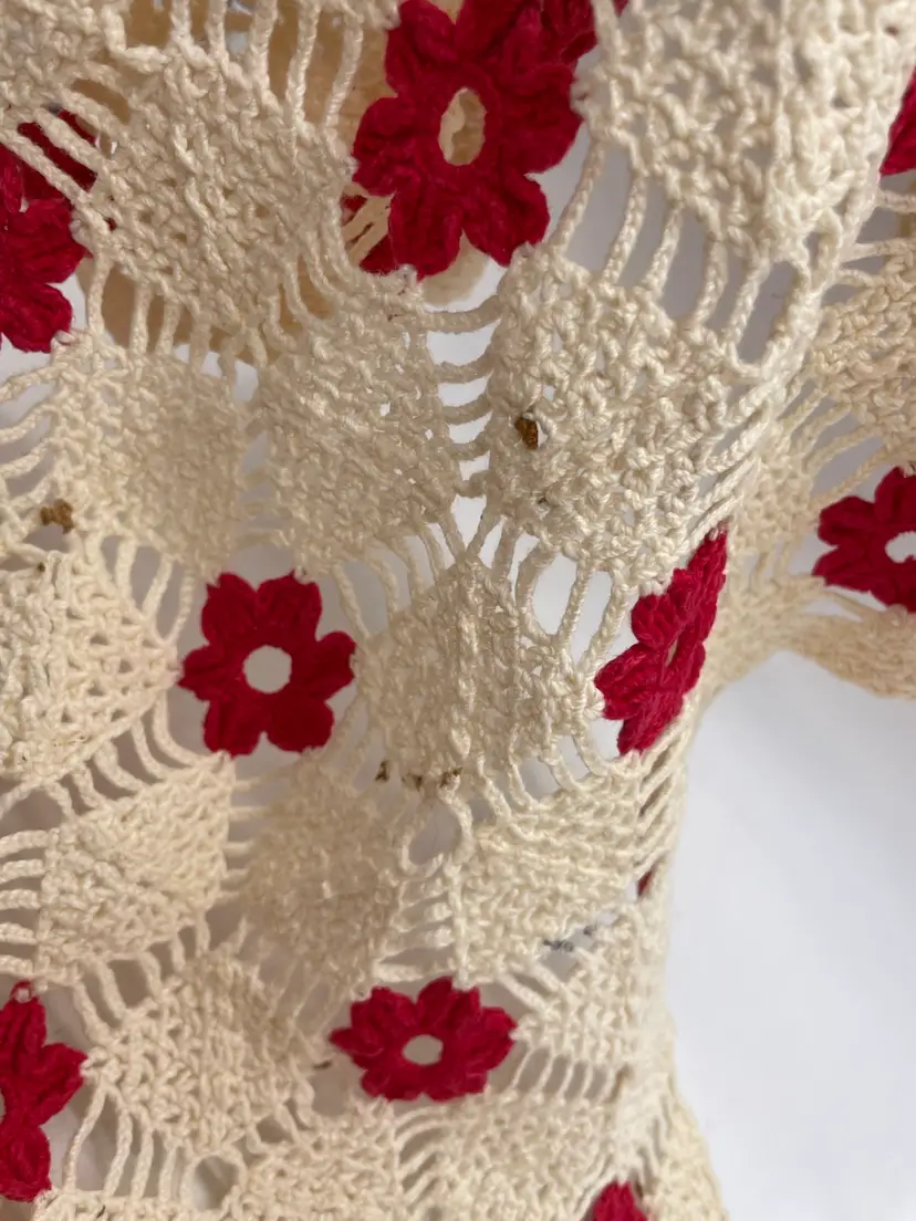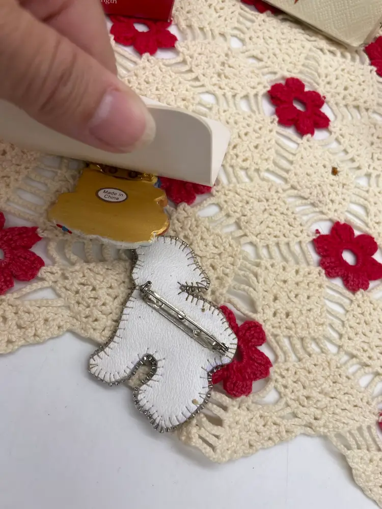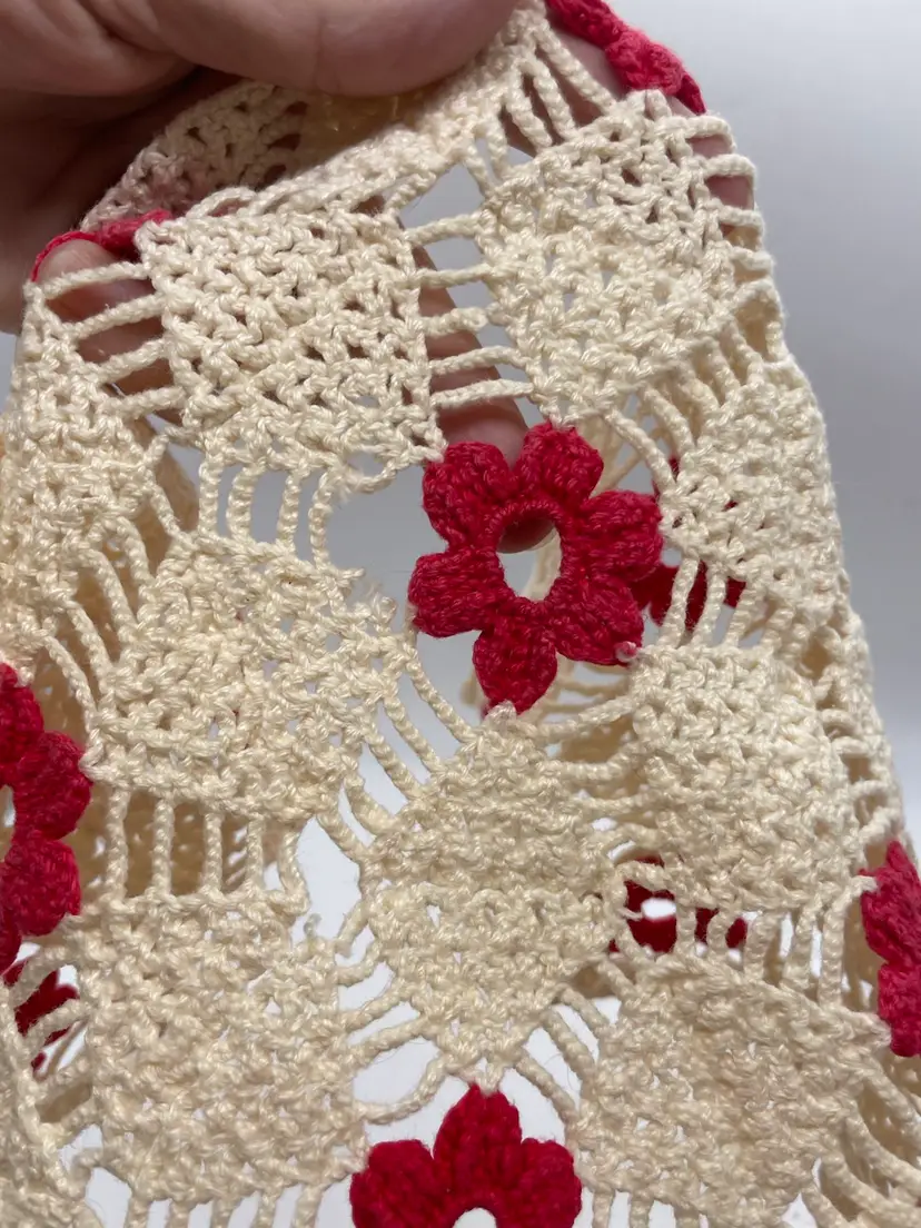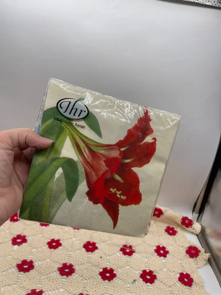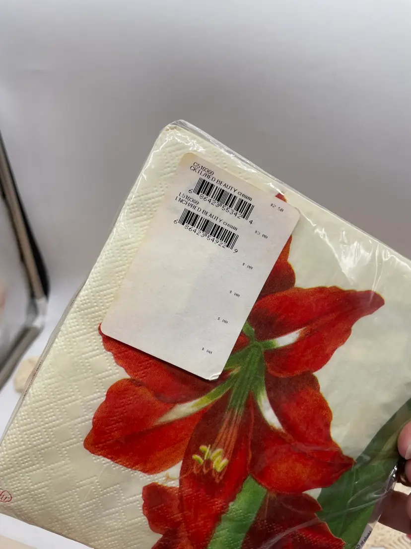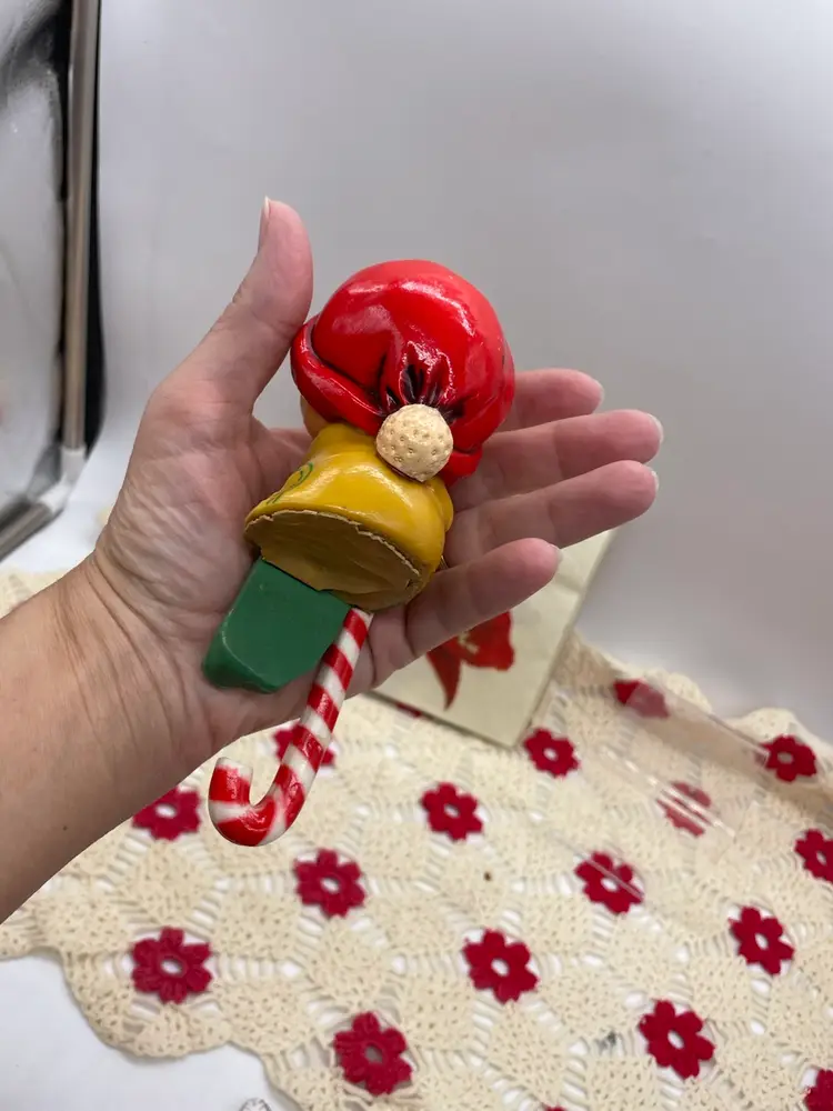 Crocheted dresser doily 24”X 14” - minor condition issues.. Home range, red beauty flower on cream napkin x 20 – made in Germany. House of Lloyd 1996 two mice/Wiseman ornaments. Elf with candy cane hallmark cards stocking holder. Two brooches – Santa sleigh resin made in China and beaded lamb on leather. Holiday time multicolored indoor light set X 20 – new inbox vintage.