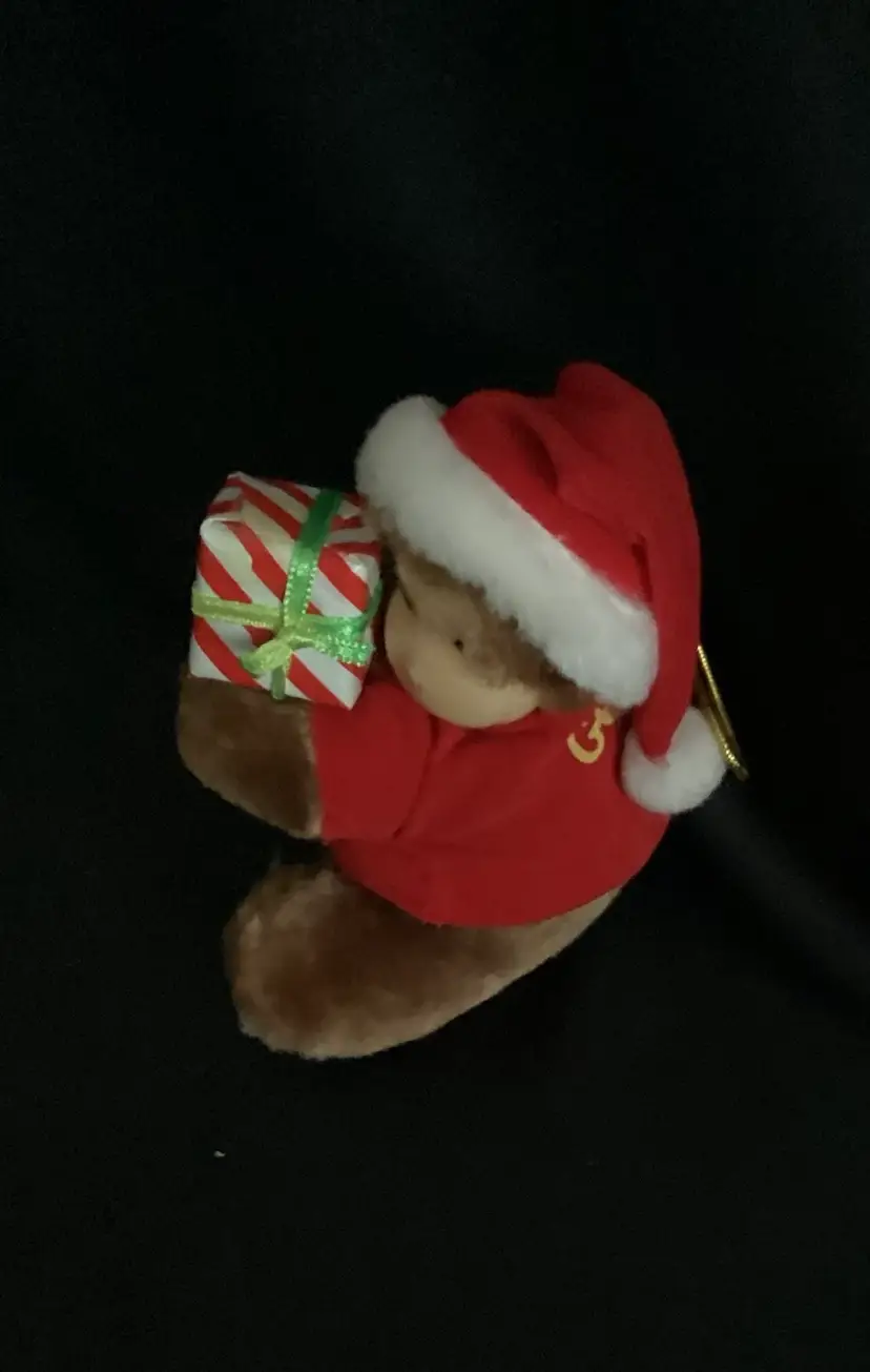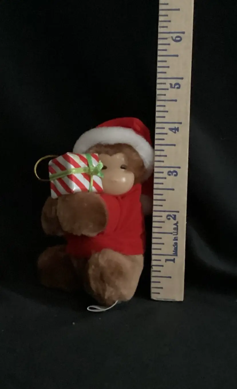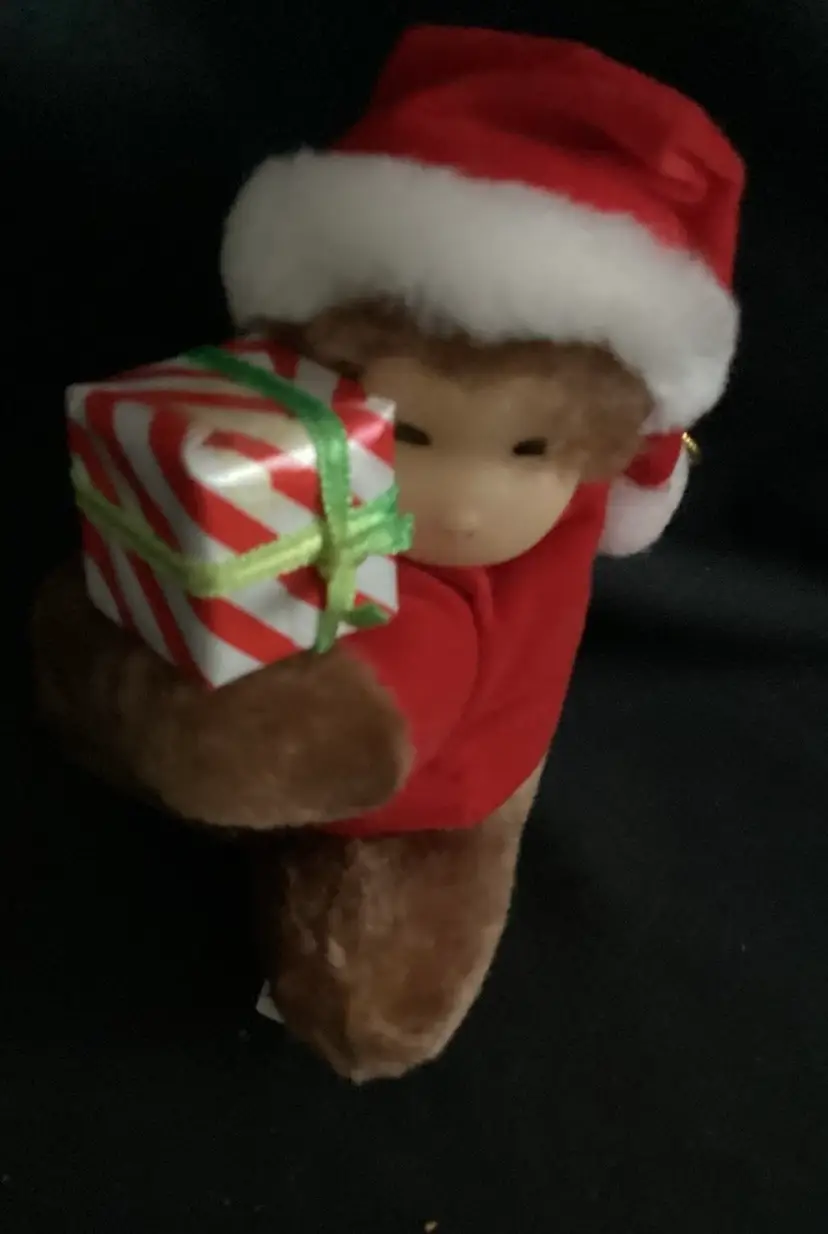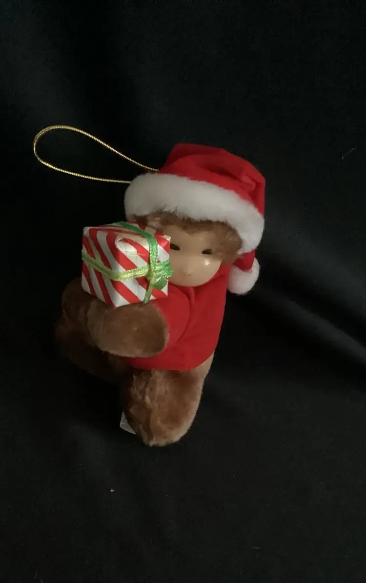 Vintage Christmas monkey made of fabric, velvet & wood or wood like head - gold hangar cord