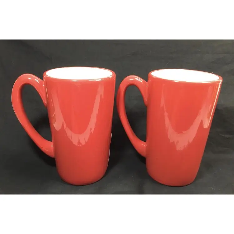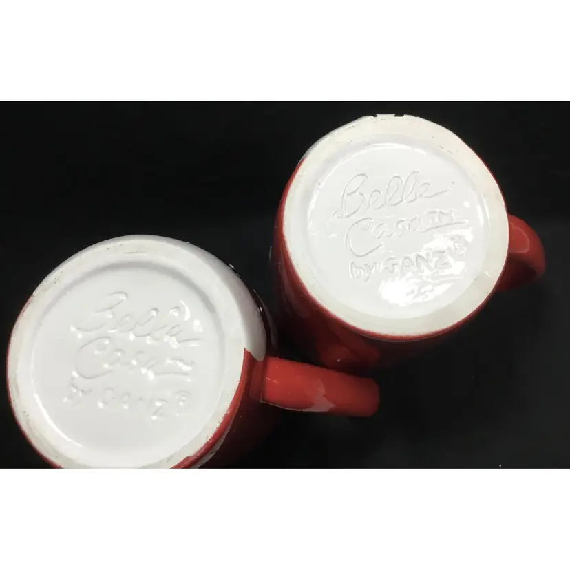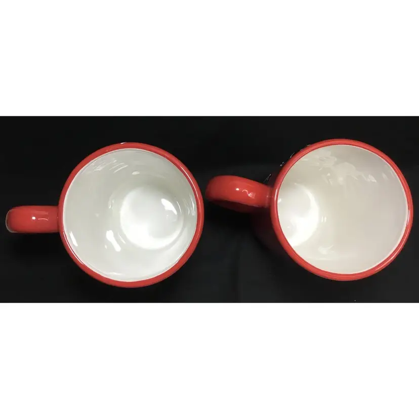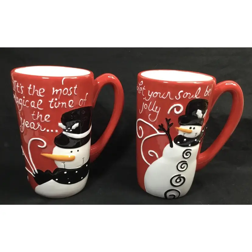 Set of 2 large snowman mugs, Bella Casa by Gantz, 6 inches tall by 3 inches wide at rim, holds 2.25 cups of liquid. Red glossy background, white glossy interior, snowman with saying on front of each