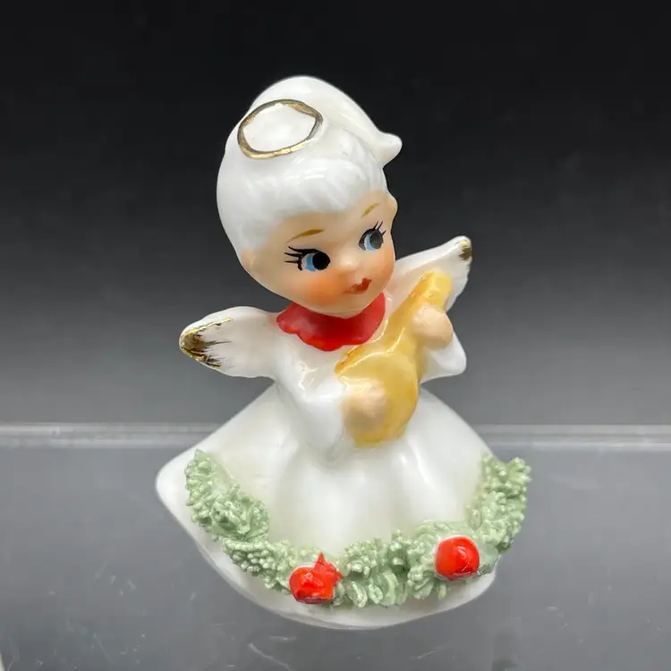 No damage to this little Christmas angel 2 inches tall made in Japan with spaghetti Holly and red berries.
