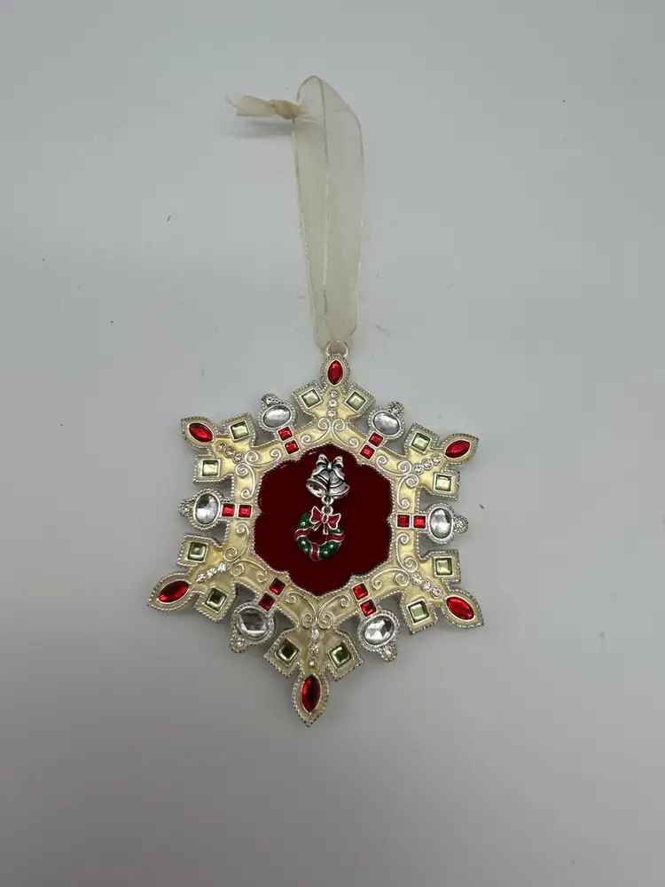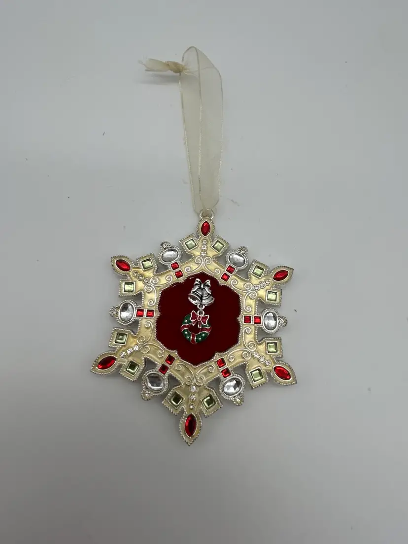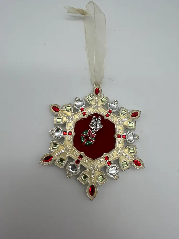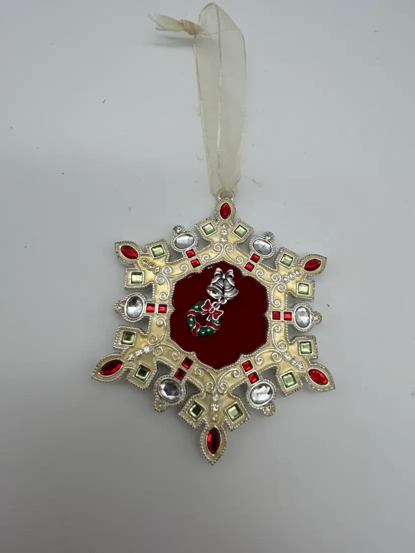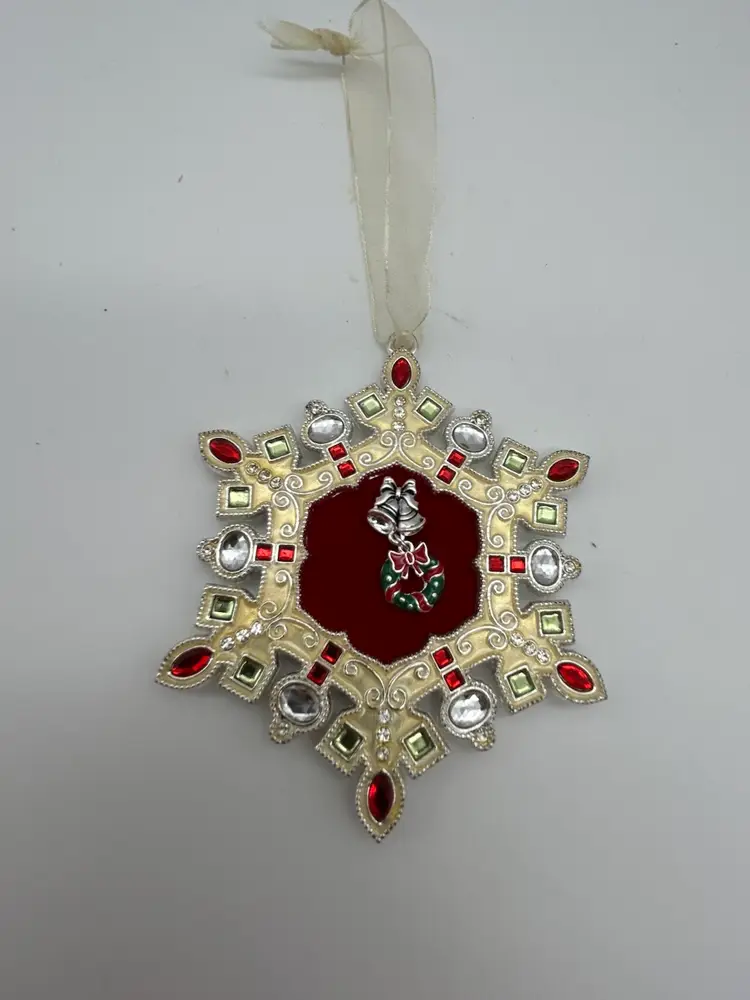 I purchased the photo frame ornament and added felt and then hung a broken piece of jewelry to make it one of a kind. It measures approximately 4” wide and 3 1/2” tall.