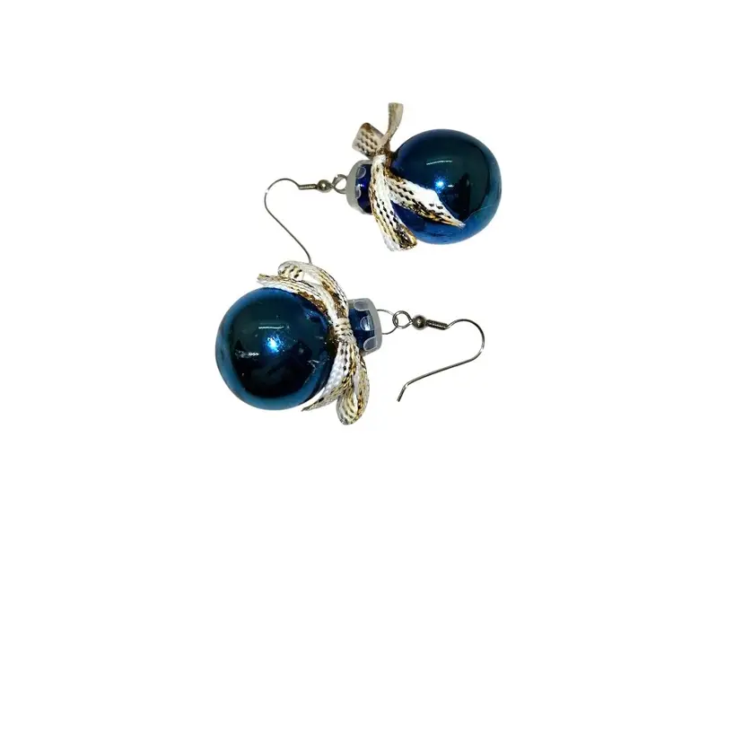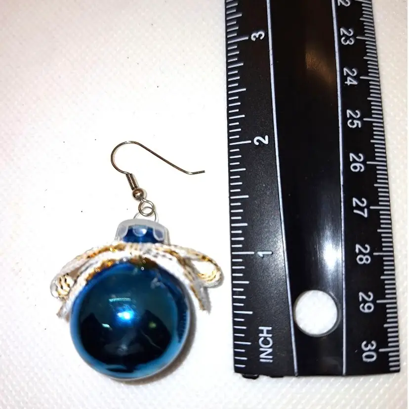 Christmas Ornament Earrings Blue Ball White and Gold Bow Fishhook Ear Wires See photos for measurements