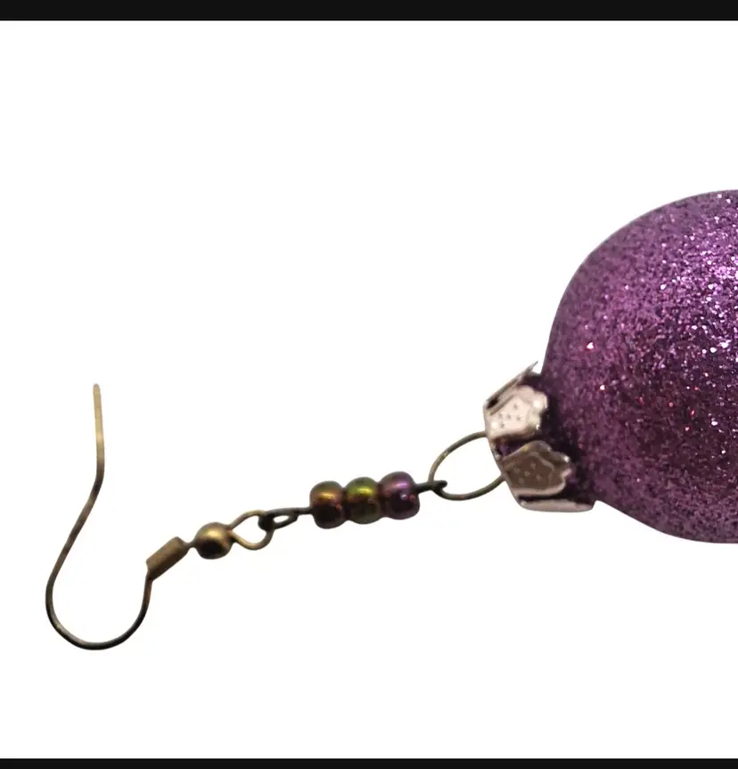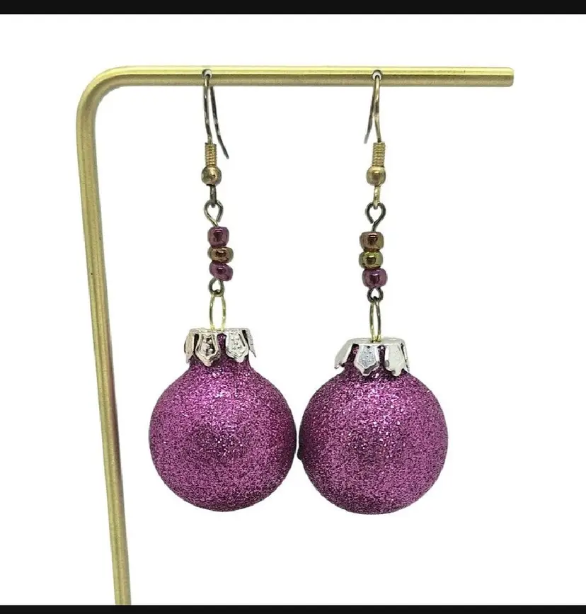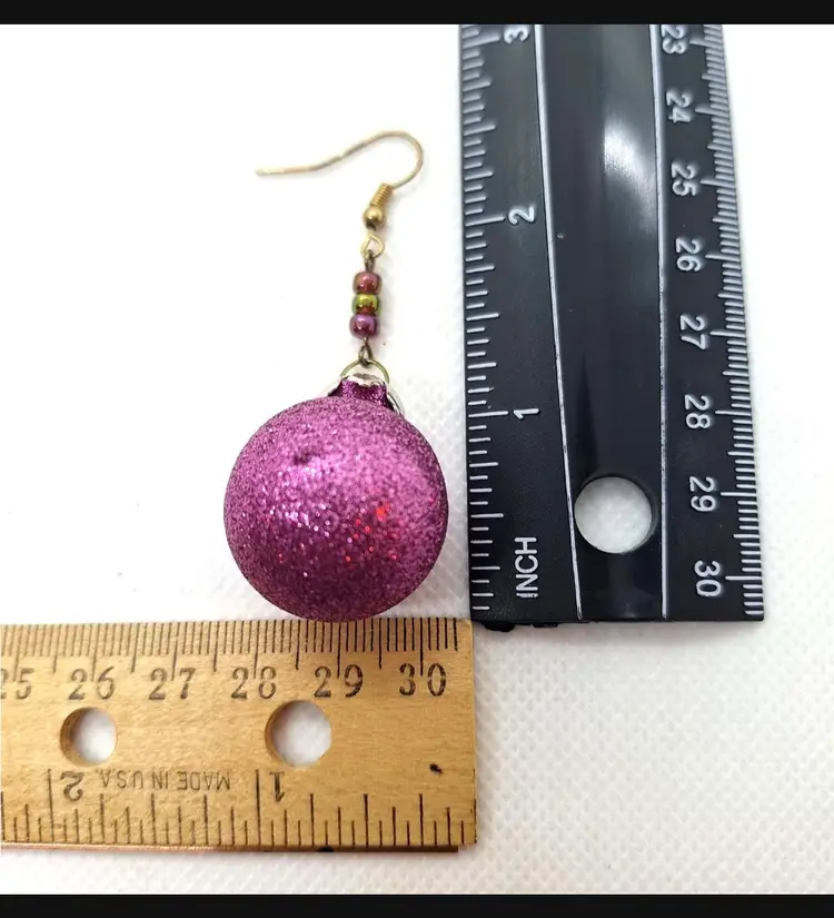Christmas Ornament Earrings Fuchsia Sparkle Ball Iridescent Beads Gold Tone Fishhook Ear Wires See photos for measurements