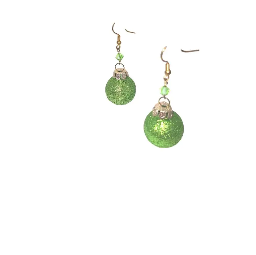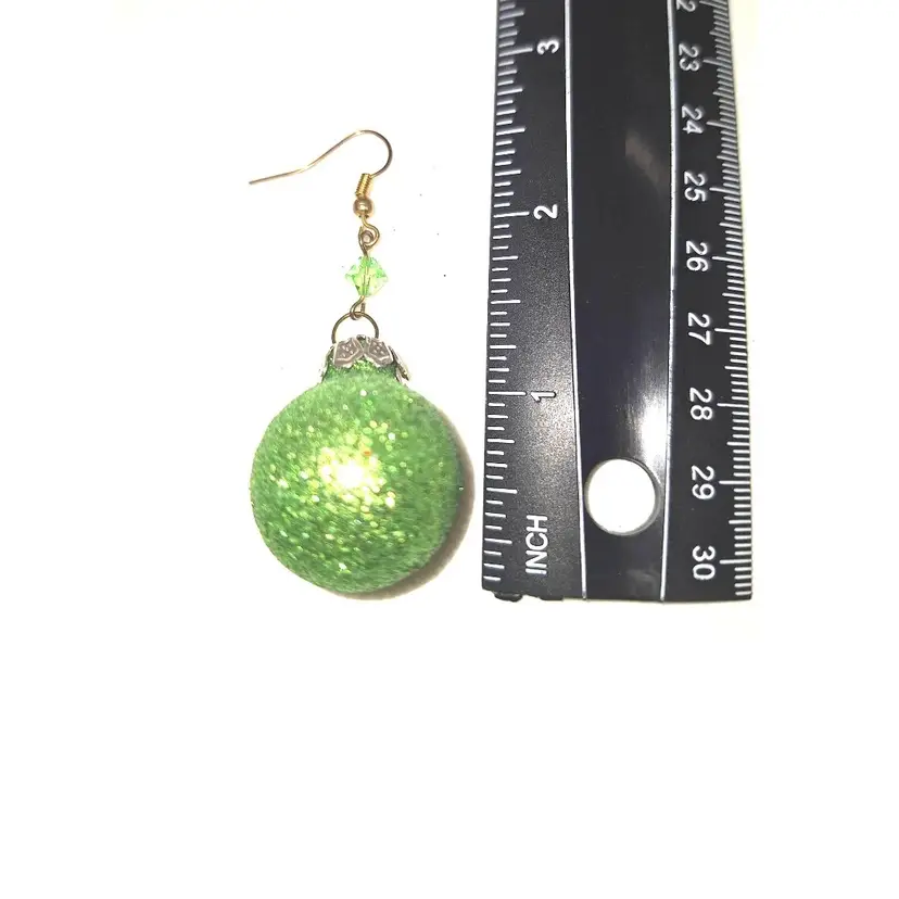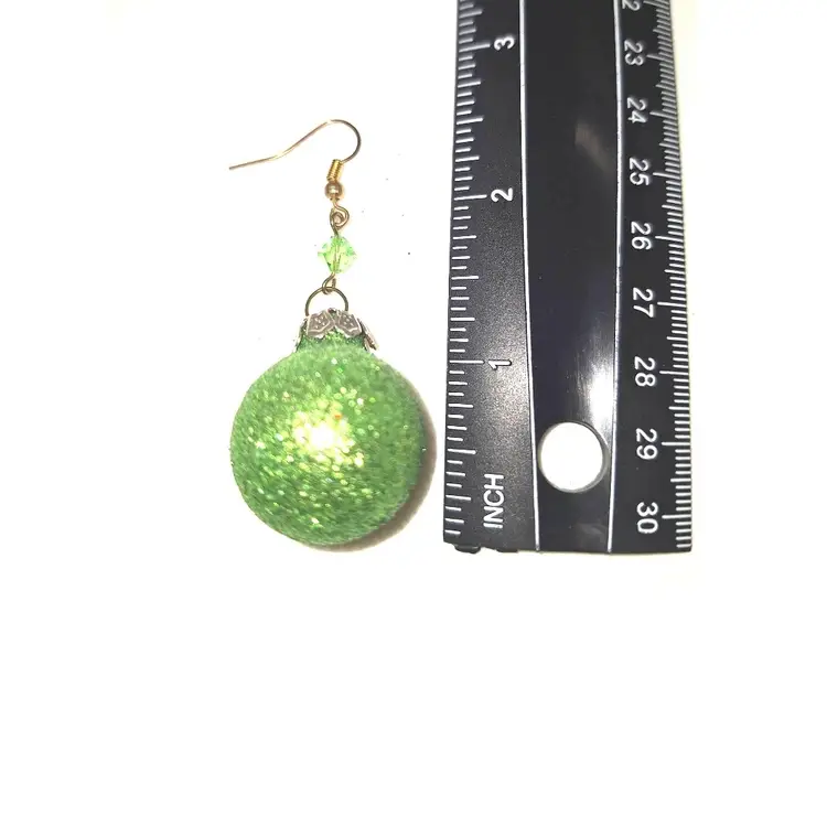Christmas Ornament Earrings Green Sparkly Ball Green Bead Gold Tone Fishhook Ear Wires See photos for measurements