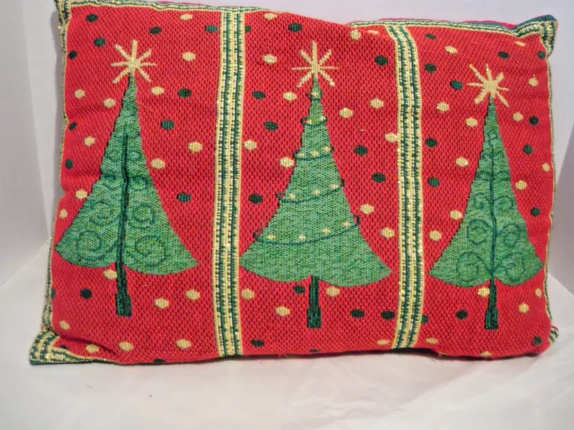This product is a pair of 12x17 rectangular Christmas pillows featuring a festive Christmas tree tapestry design with gold thread accents. Made from a comfortable cotton blend material, these decorative pillows are perfect for adding a touch of holiday cheer to your living room decor. The red color and textured design make them a standout addition to your Christmas decorations, and the holiday-themed design is sure to bring a warm and festive feel to your home during the holiday season.