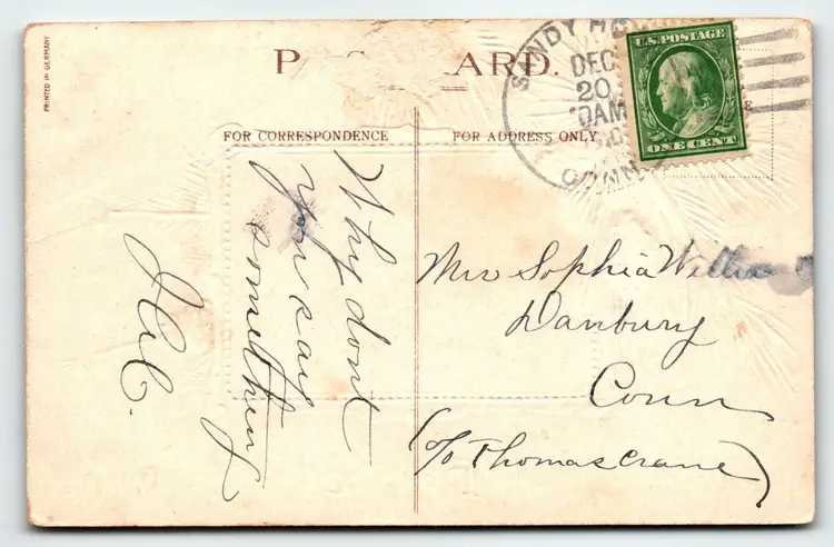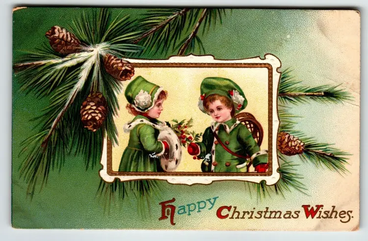Number of Items in Set: 1 Unit of Sale: Single Unit Artist: Unknown Occasion: Christmas Size: Standard (5.5 x 3.5 in) Custom Bundle: No Material: Paper Year Manufactured: 1910 Original/Licensed Reprint: Original Brand/Publisher: Unknown Subject: Children Type: Printed (Lithograph) Era: Pre-War (Pre-1914) Theme: Art, Children & Infants, Fantasy, Greetings, Holiday, Boy, Girl Features: Divided Back, Embossed Time Period Manufactured: 1900-1919 Country/Region of Manufacture: Germany Postage Condition: Posted