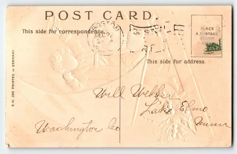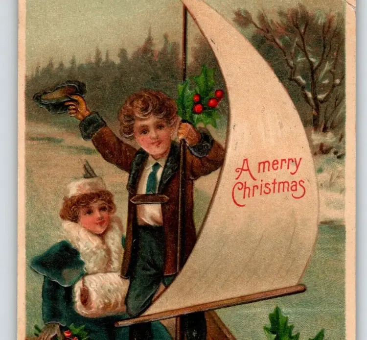 Number of Items in Set: 1 Unit of Sale: Single Unit Artist: Unknown Occasion: Christmas Size: Standard (5.5 x 3.5 in) Custom Bundle: No Material: Paper Year Manufactured: 1911 Original/Licensed Reprint: Original Brand/Publisher: BW Subject: Children Type: Printed (Lithograph) Era: Pre-War (Pre-1914) Theme: Art, Children & Infants, Greetings, Holiday, Boy, Girl, Sailboat, Muff Features: Divided Back, Embossed Time Period Manufactured: 1900-1919 Country/Region of Manufacture: Germany Postage Condition: Posted