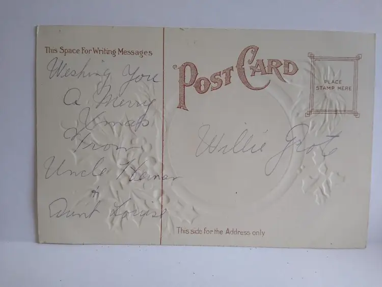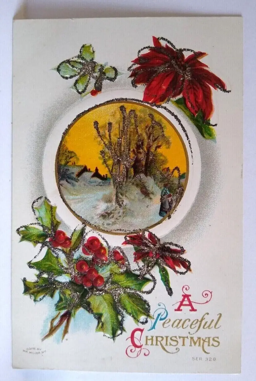 Size: Standard (5.5 x 3.5 in) Custom Bundle: No Personalize: No Type: Printed (Lithograph) Year Manufactured: 1910 Number of Items in Set: 1 Signed: No Original/Licensed Reprint: Original Occasion: Christmas Time Period Manufactured: 1900-1919 Unit of Sale: Single Unit Era: Pre-War (Pre-1914) Artist: Unknown Country/Region of Manufacture: United States Material: Paper Theme: Art, Flowers & Plants, Greetings, Holiday Features: Divided Back, Embossed Subject: Poinsettias Postage Condition: Unposted Brand/Publisher: W.M. Miller Franchise: Unknown
