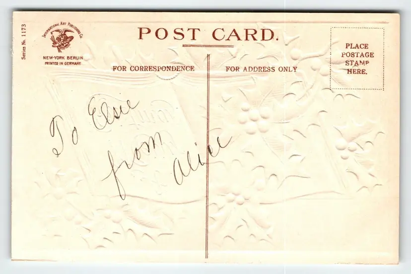 Unit of Sale: Single Unit Artist: Unknown Number of Items in Set: 1 Occasion: Christmas Size: Standard (5.5 x 3.5 in) Signed: No Material: Paper Year Manufactured: 1910 Original/Licensed Reprint: Original Brand/Publisher: International Art Subject: Flowers Personalize: No Type: Printed (Lithograph) Era: Pre-War (Pre-1914) Theme: Art, Fantasy, Floral & Gardens, Flowers & Plants, Greetings, Holiday, Pointsettias, Song Book Features: Embossed, Divided Back Time Period Manufactured: 1900-1919 Country/Region of Manufacture: Germany Postage Condition: Unposted