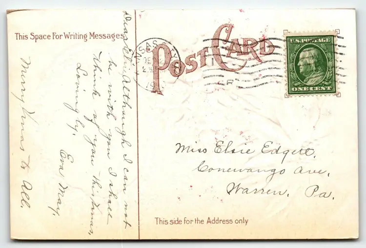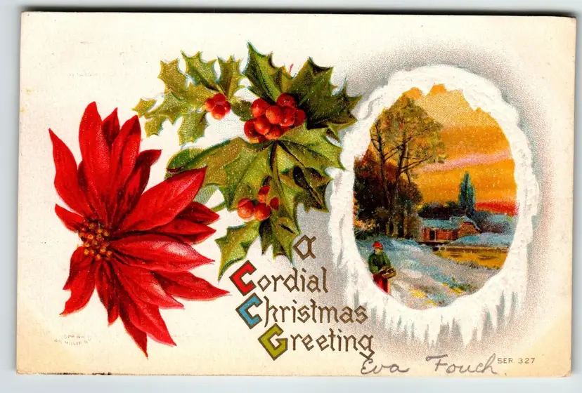 Unit of Sale: Single Unit Artist: Unknown Number of Items in Set: 1 Occasion: Christmas Size: Standard (5.5 x 3.5 in) Material: Paper Year Manufactured: 1910 Original/Licensed Reprint: Original Brand/Publisher: Unbranded Subject: Flowers Type: Printed (Lithograph) Era: Pre-War (Pre-1914) Theme: Art, Fantasy, Floral & Gardens, Flowers & Plants, Greetings, Holiday, Pointsettias Features: Embossed, Divided Back Time Period Manufactured: 1900-1919 Country/Region of Manufacture: Unknown Postage Condition: Posted