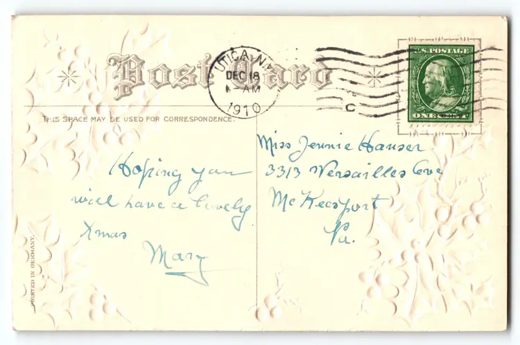 Posted with 1910 cancel and stamp. Antique original vintage post card. Super clean with light age wear. Stock #ch504.