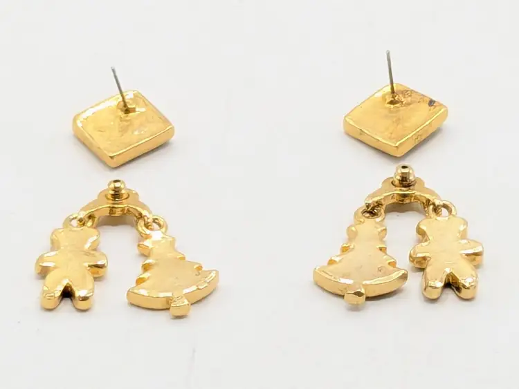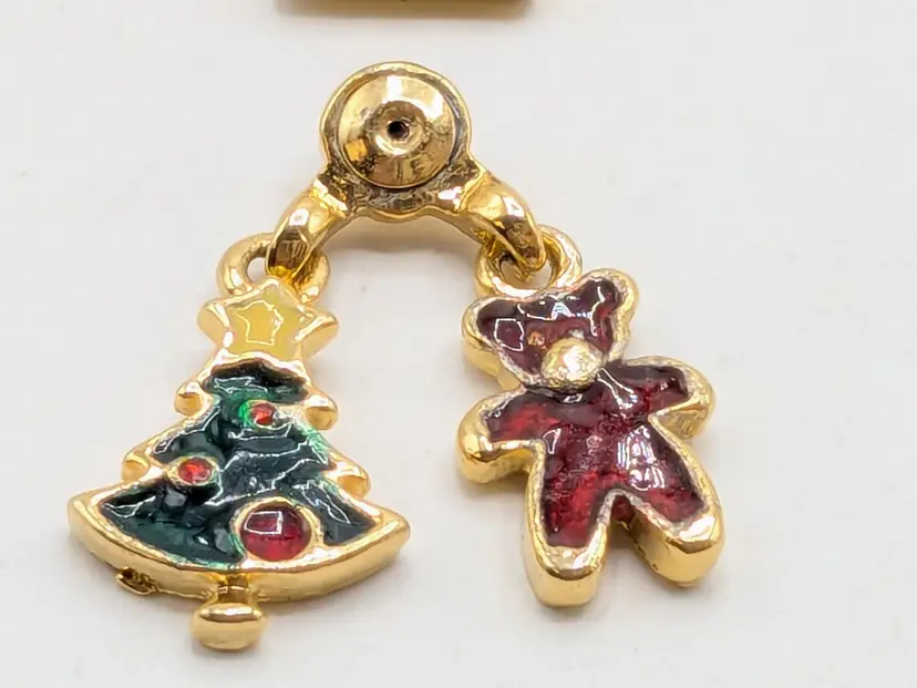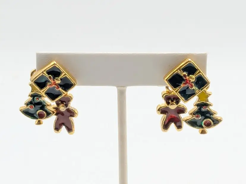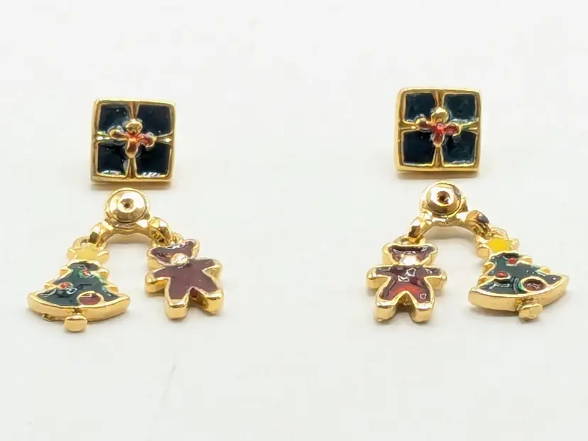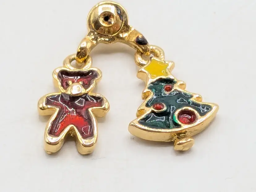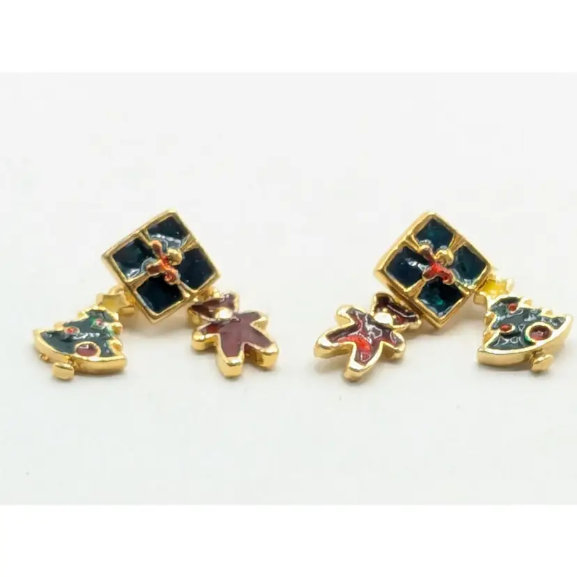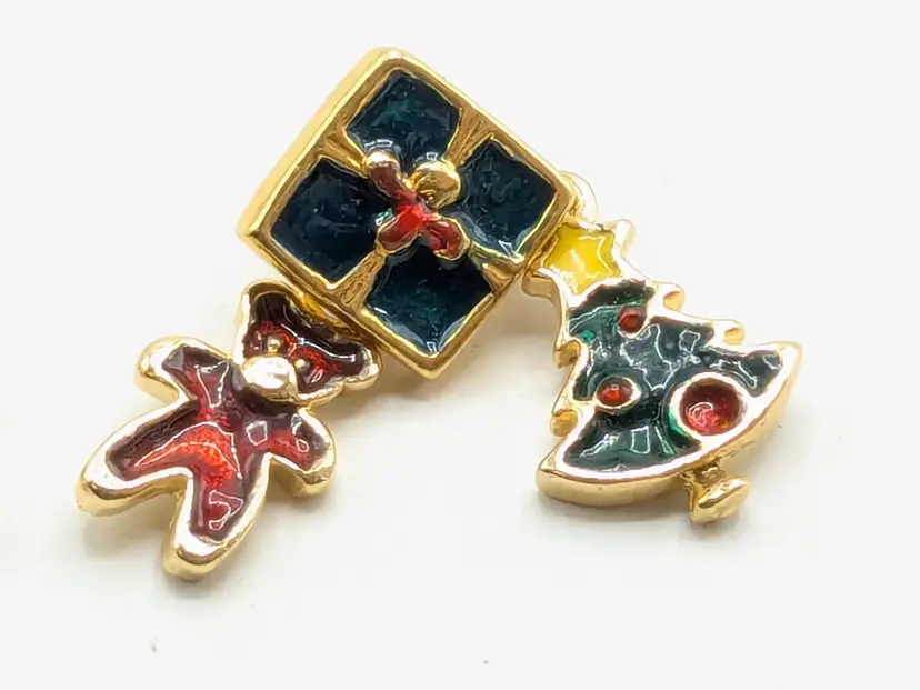 Good condition. The gift/present can be worn alone or with the dangling charms. Features festive Christmas tree and gingerbread man charms with colorful enamel details. Perfect for adding a touch of holiday cheer to your outfit. Measures 1 1/4" in length. (EN2)