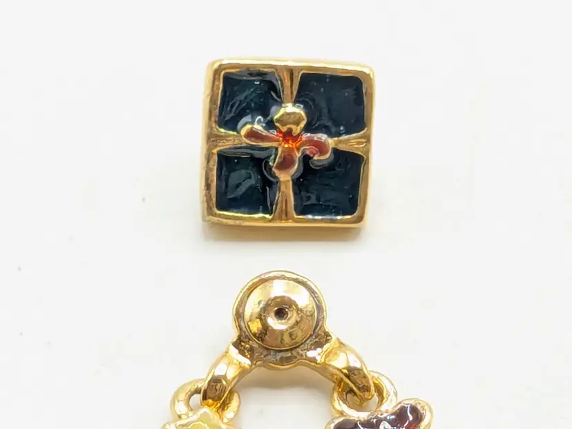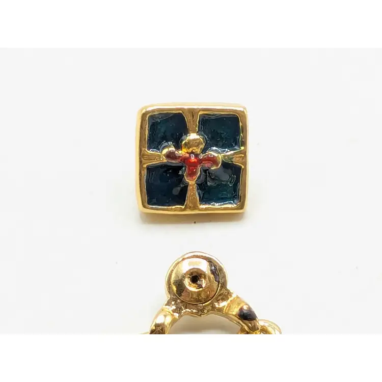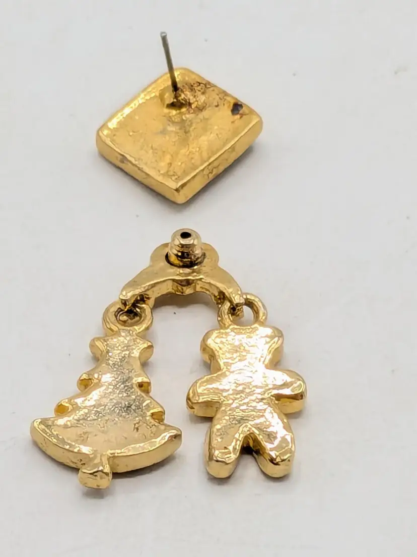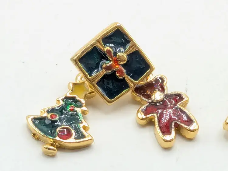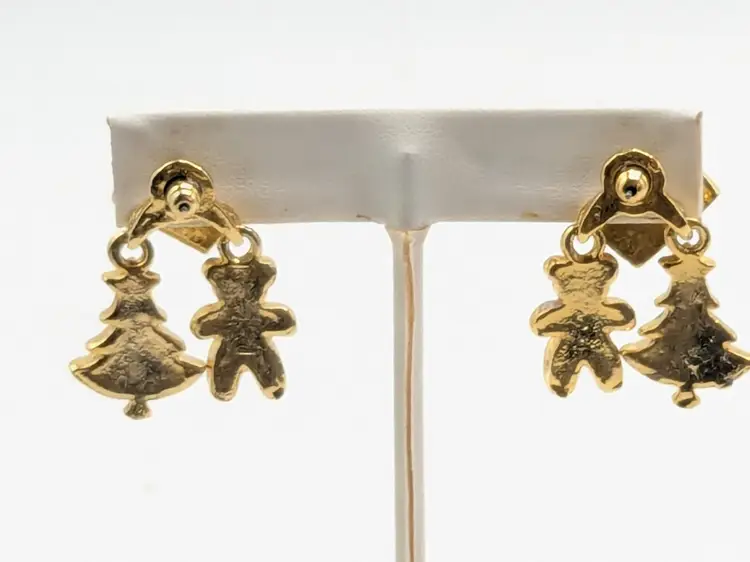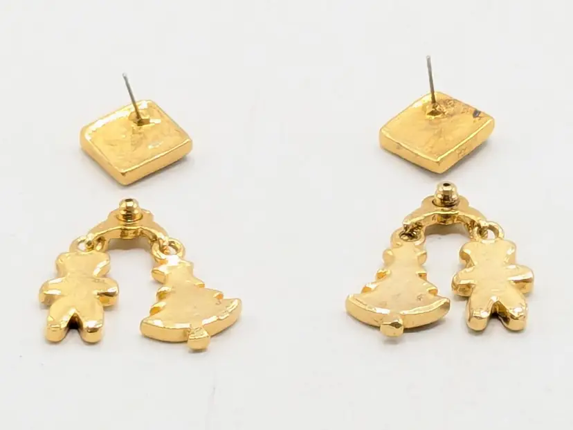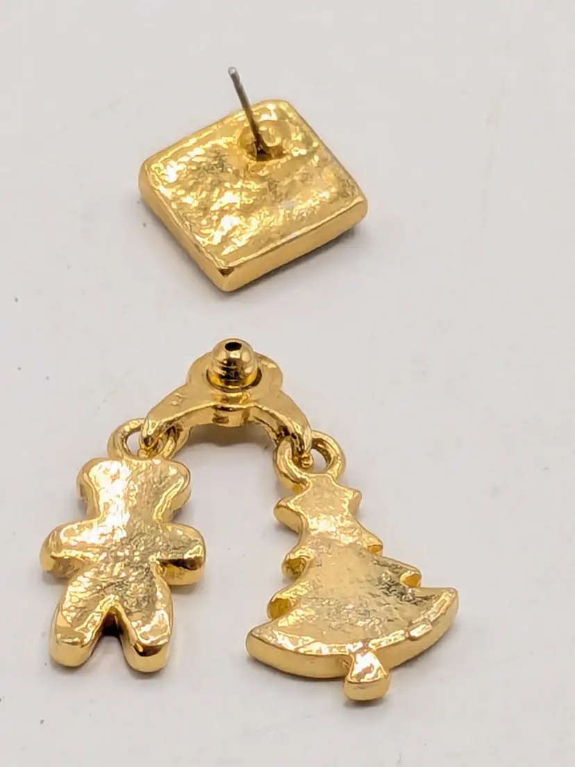 Good condition. The gift/present can be worn alone or with the dangling charms. Features festive Christmas tree and gingerbread man charms with colorful enamel details. Perfect for adding a touch of holiday cheer to your outfit. Measures 1 1/4" in length. (EN2)