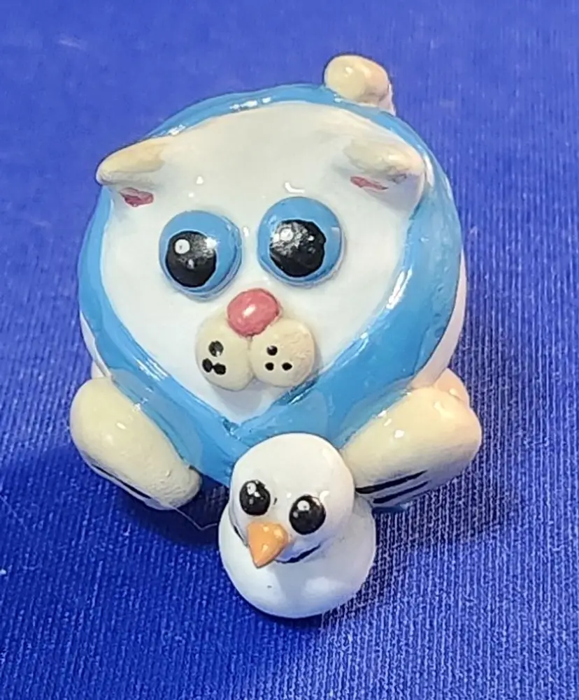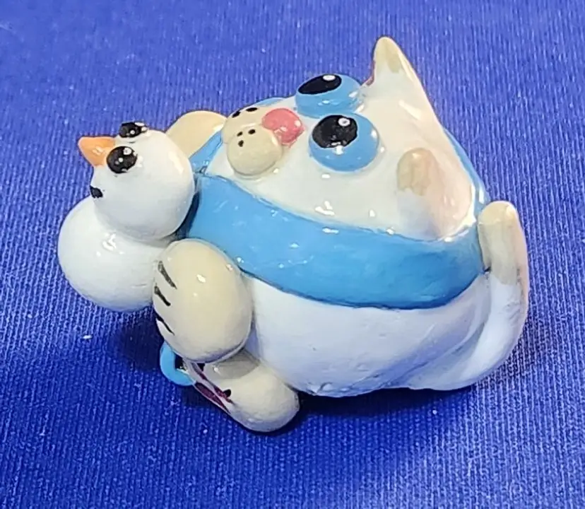 Each cat is hand-sculpted using polymer clay. The center of each cat has an aluminum foil core (to add strength to the final piece and to ensure even baking). Acrylic paints are used and each cat is sealed using a resin-based gloss finish (set using UV light).