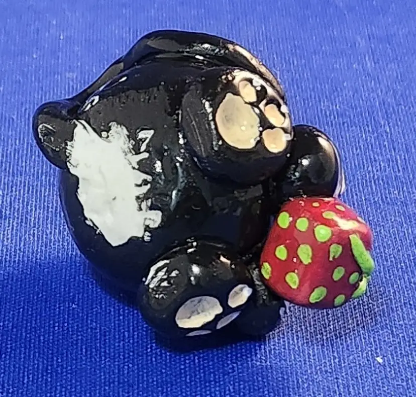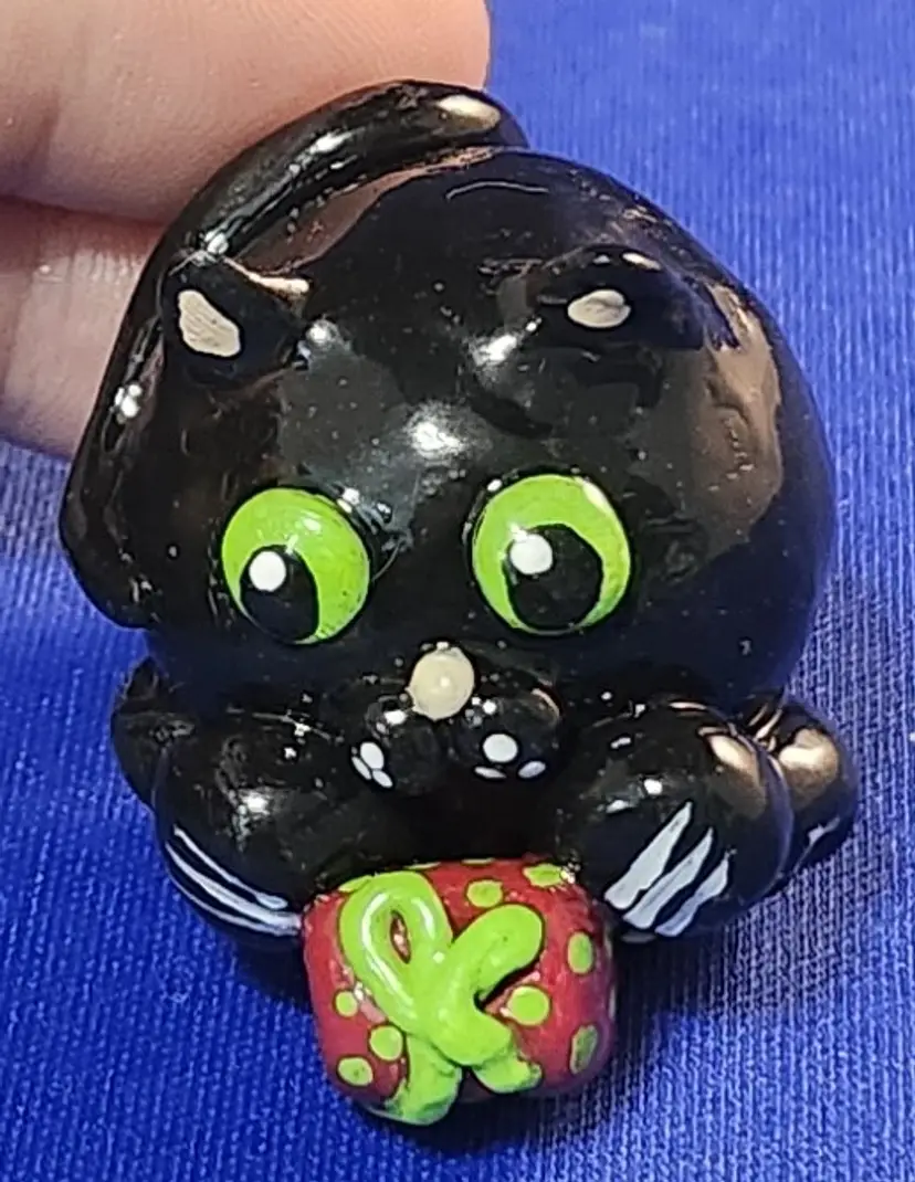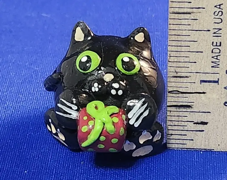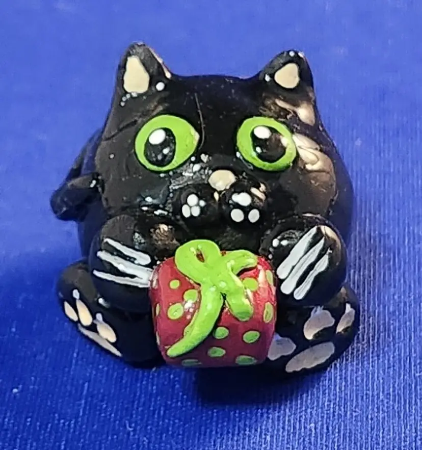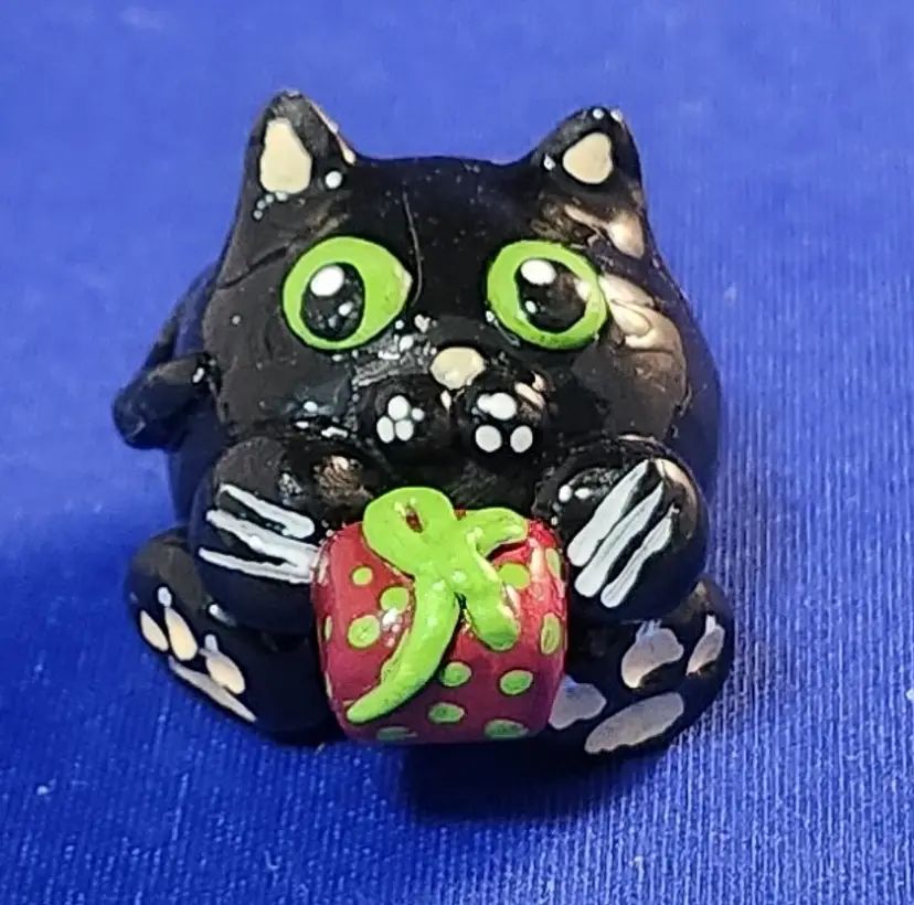 Each cat is hand-sculpted using polymer clay. The center of each cat has an aluminum foil core (to add strength to the final piece and to ensure even baking). Acrylic paints are used and each cat is sealed using a resin-based gloss finish (set using UV light).