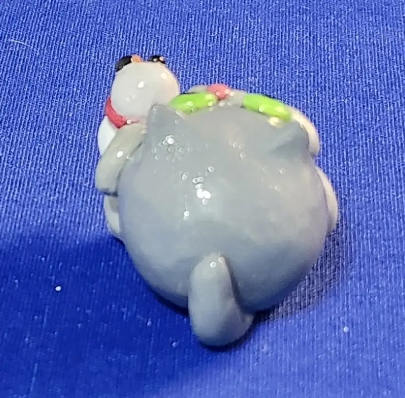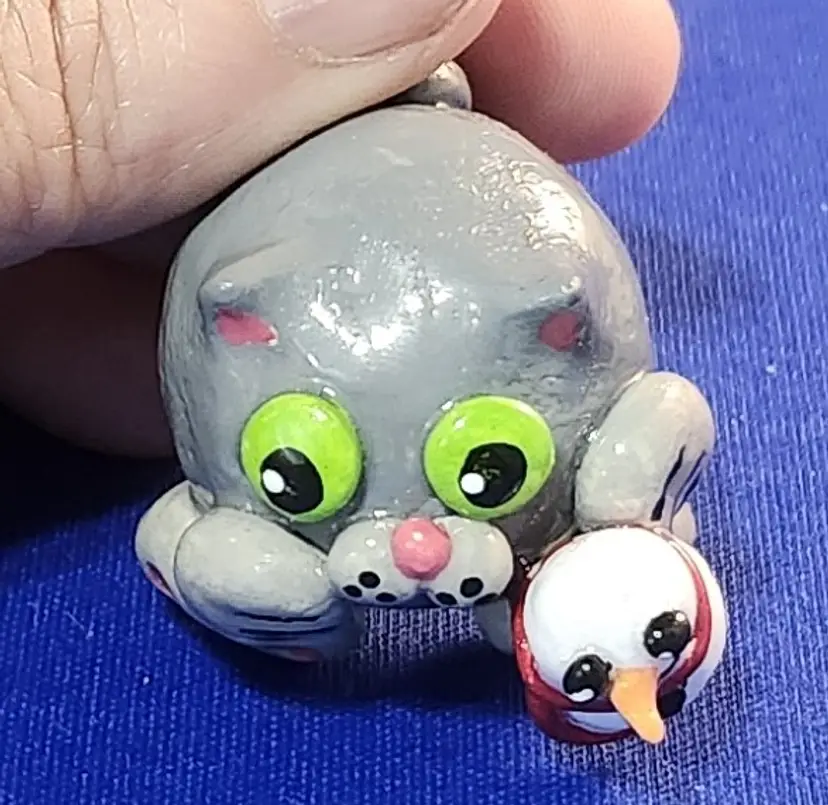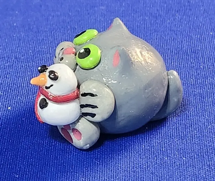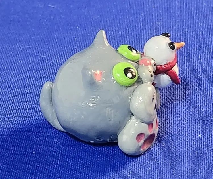 Each cat is hand-sculpted using polymer clay. The center of each cat has an aluminum foil core (to add strength to the final piece and to ensure even baking). Acrylic paints are used and each cat is sealed using a resin-based gloss finish (set using UV light).