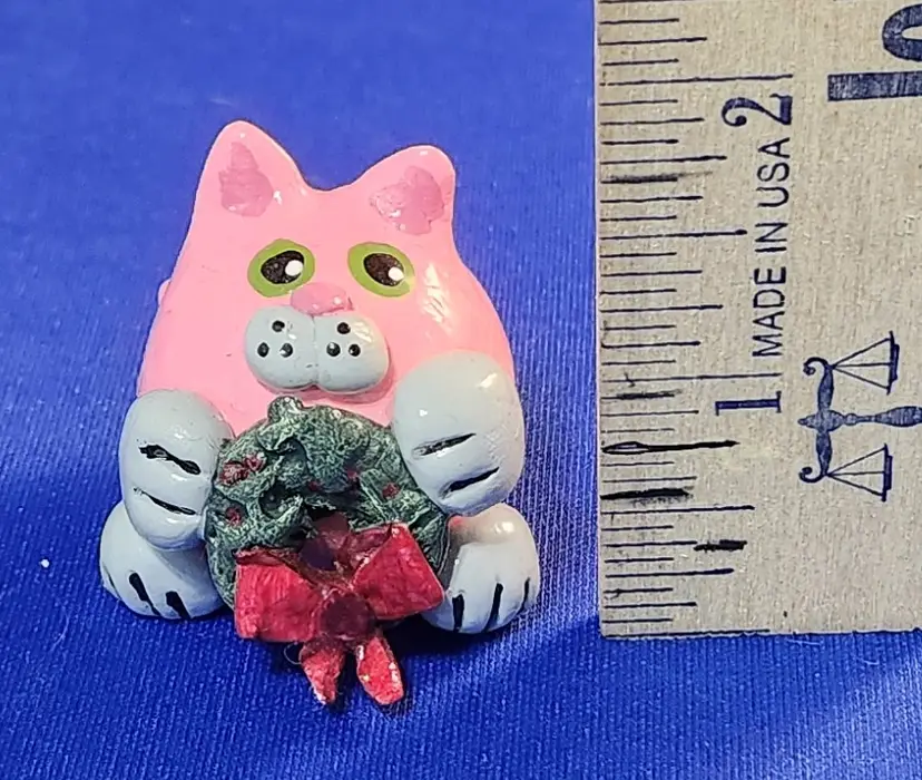 Pink cat holding a green wreath with a red bow.