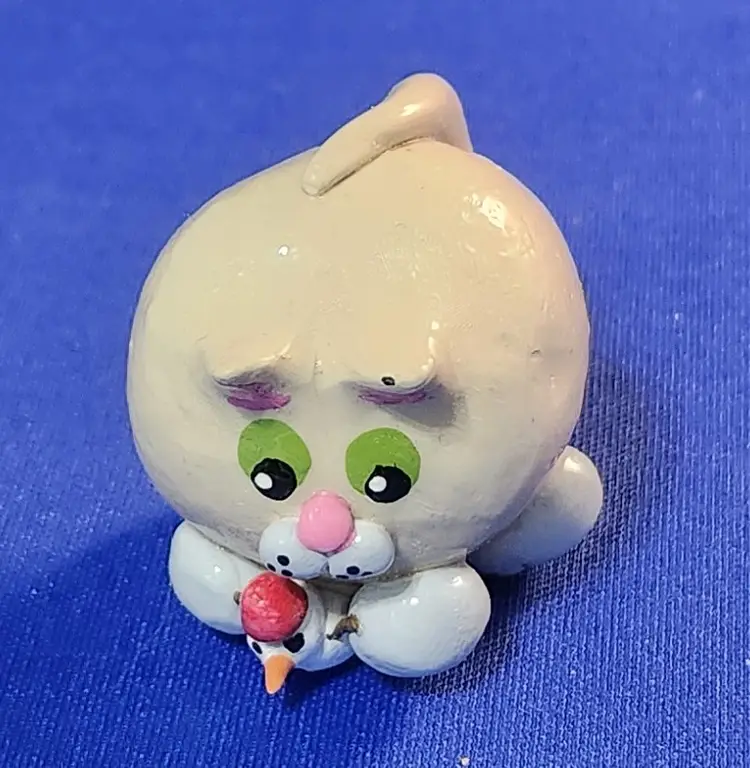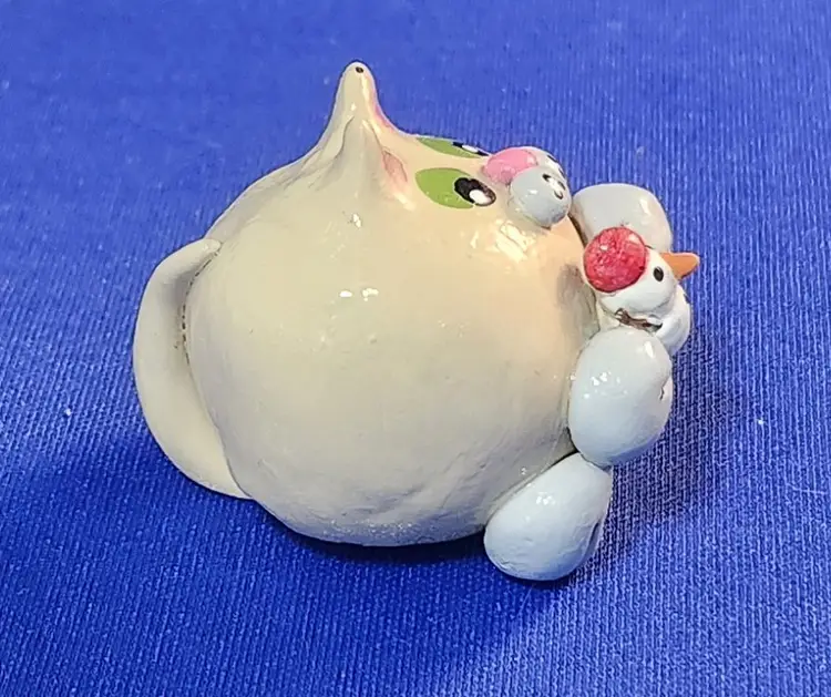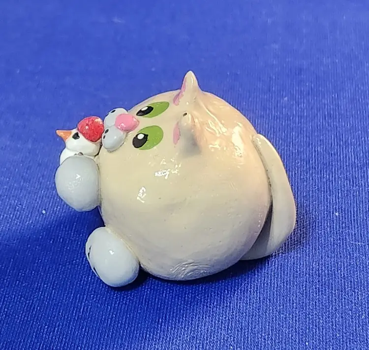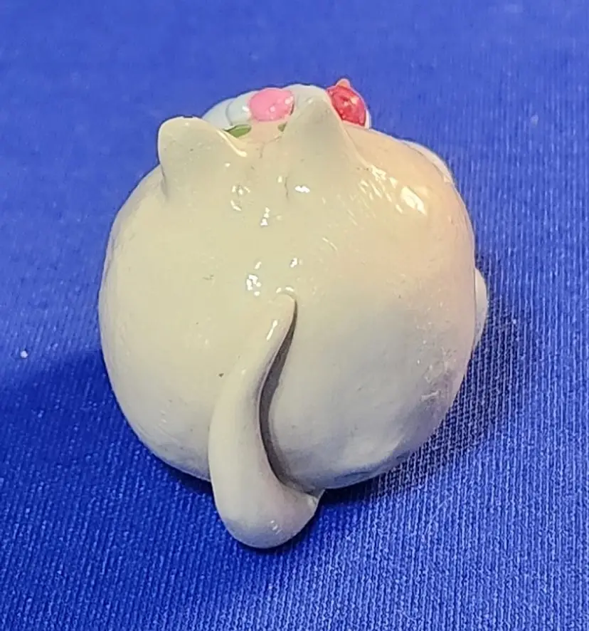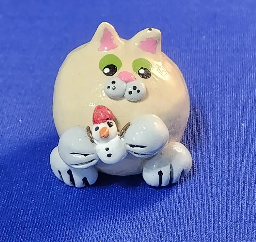 Each cat is hand-sculpted using polymer clay. The center of each cat has an aluminum foil core (to add strength to the final piece and to ensure even baking). Acrylic paints are used and each cat is sealed using a resin-based gloss finish (set using UV light).