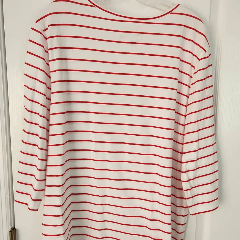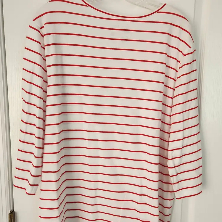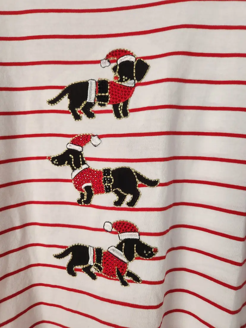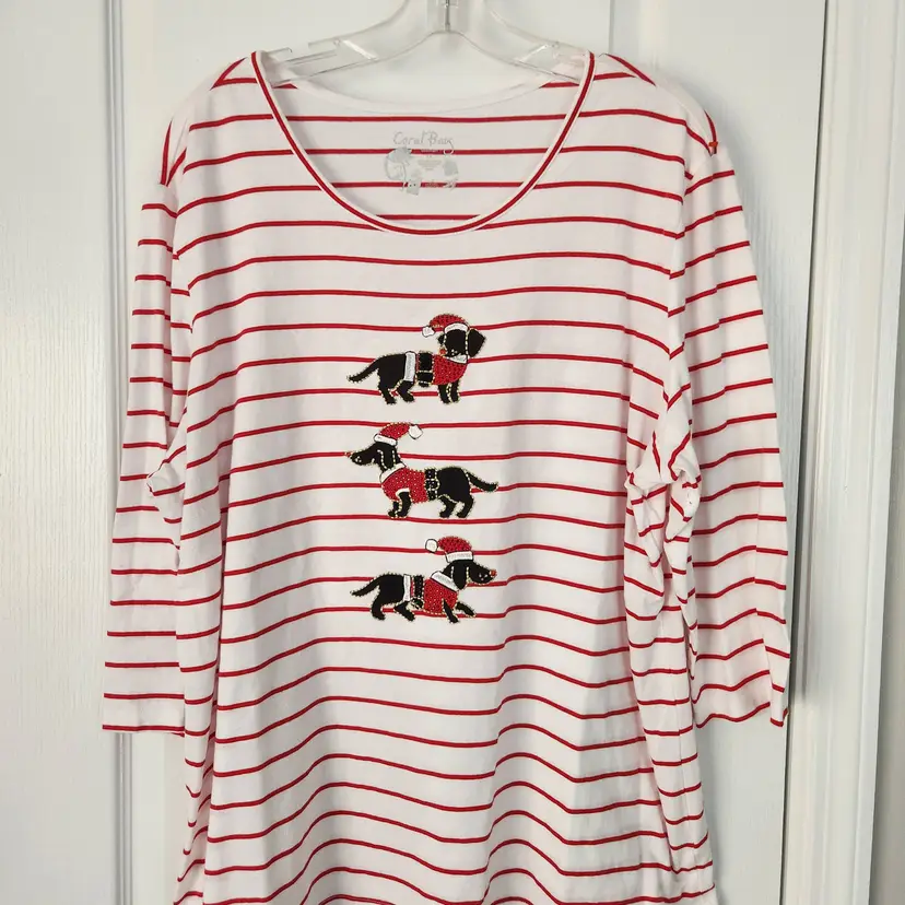 White shirt with red stripes. It has three dogs on it that look like wiener dogs. The hat, jacket, and belts that is on each dog are sparkly. The brand is Coral Bay, size 1X. It is 60% cotton and 40% polyester. The sleeves are 3/4 length. In very good condition. No stains, holes, or rips. Measurements- Sleeve length: 17 3/4 inches Pit-pit: 24 1/2 inches Length: 25 3/4 inches