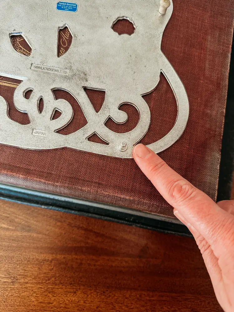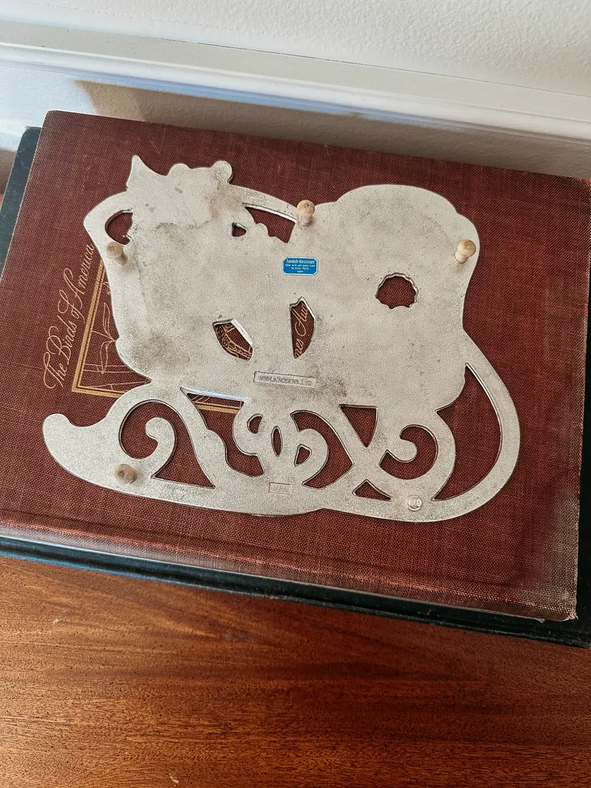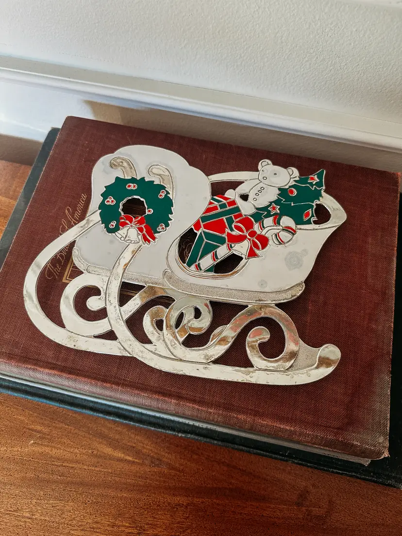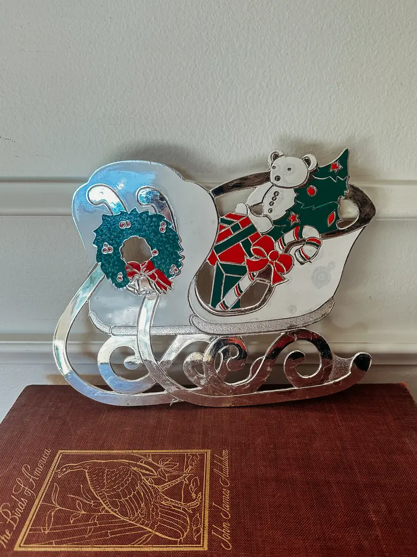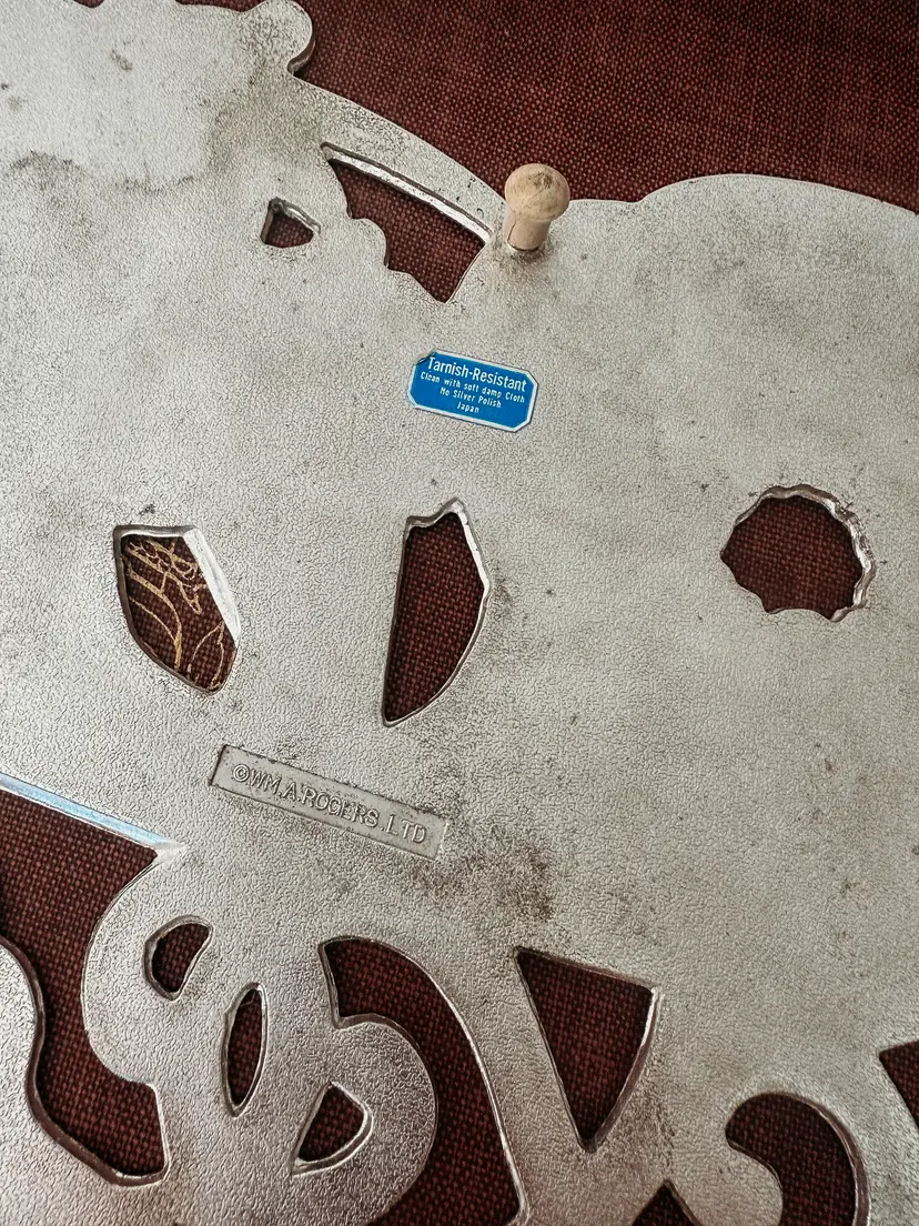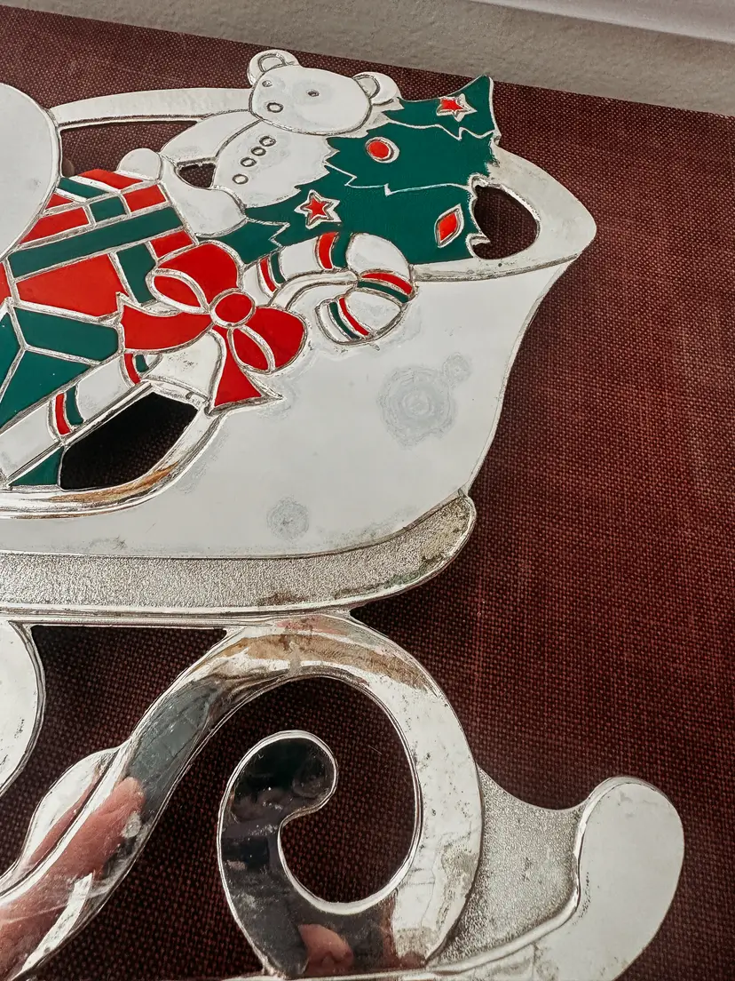 Beautiful holiday trivet from William Rogers. This trivet is missing one of its rubber feet and has some discoloration to the white enamel. Still a lovely vintage addition to your home!