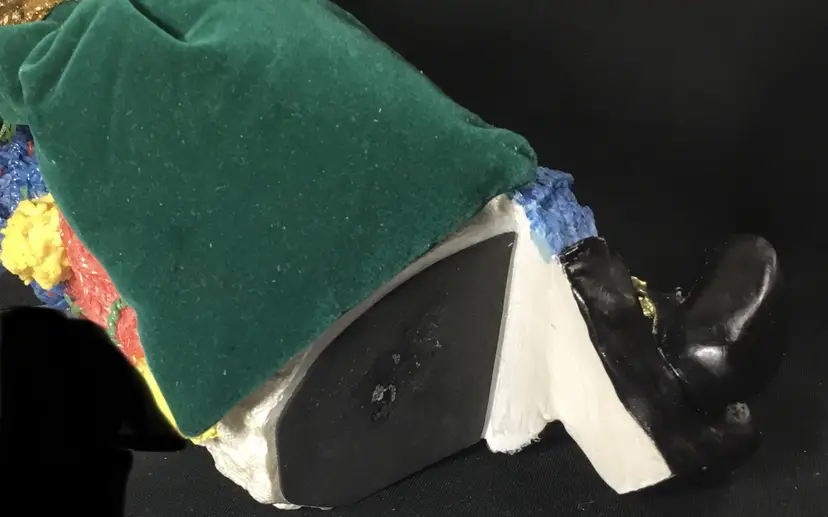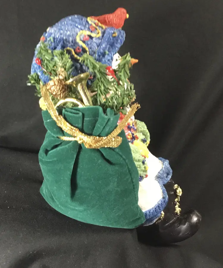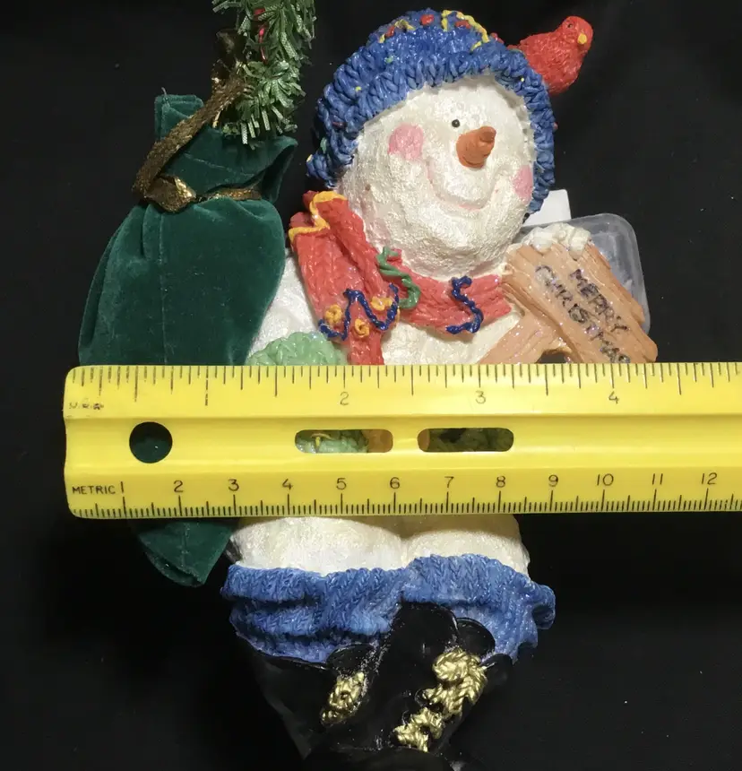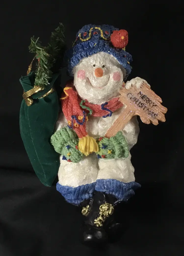 Polystone is resin mixed with powdered stone. Snowman wears blue knitted, long-tailed stocking cap with red, yellow, green flowers, yellow swirls & yellow tassel. Also wears plain blue knitted socks. Black boots with gold ties. Red knitted scarf with blue, yellow, green swirls & yellow tassels. Green knitted mittens with red, yellow, blue Xs on them. He carries a wood-look sign that says "Merry Christmas" in black lettering . All these details are in polystone with glitter all over. By his side is a green velvet (actual fabric) gift bag with gold cord and Christmas branches and toys sticking out of the top. His legs are molded in a bent position so he can sit on a shelf with his legs hanging down from the kneess. See all photos.