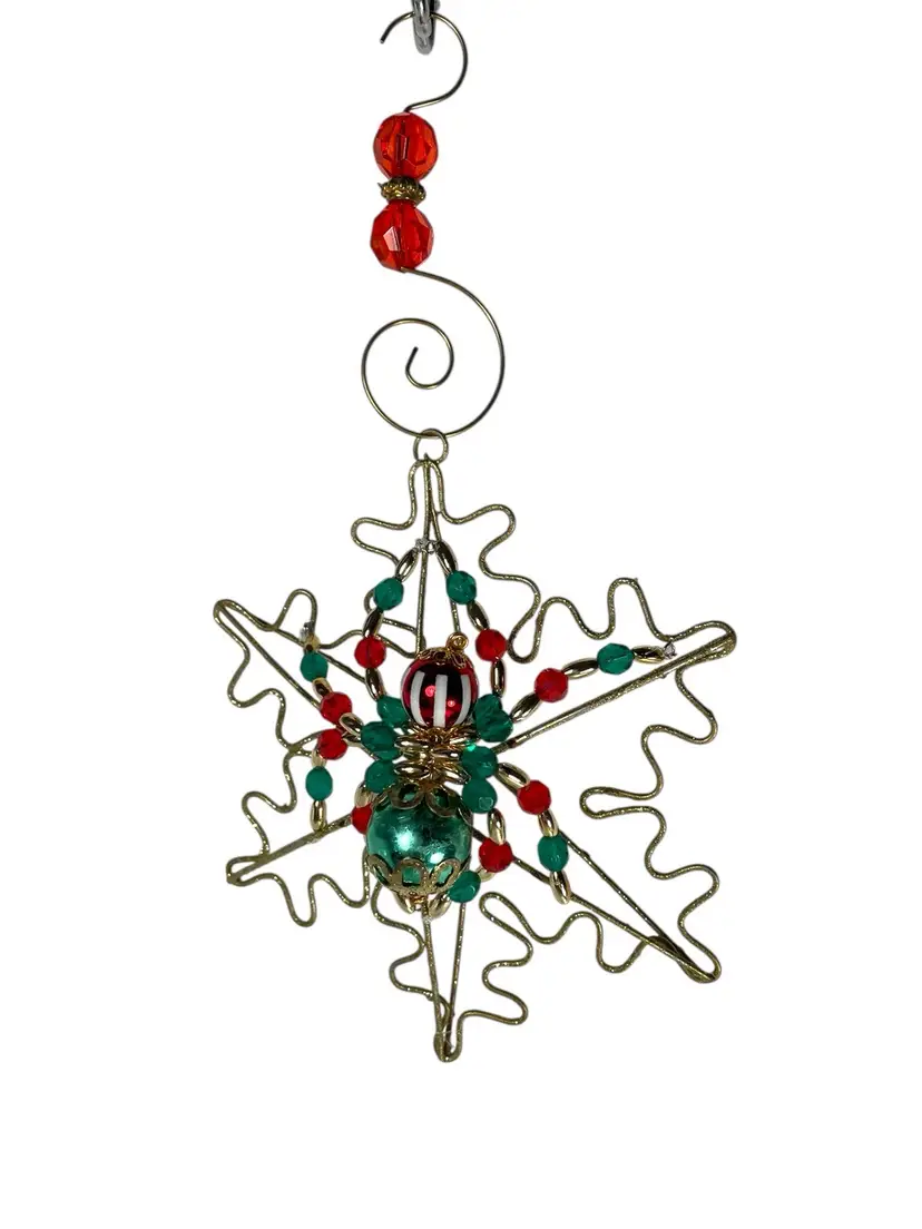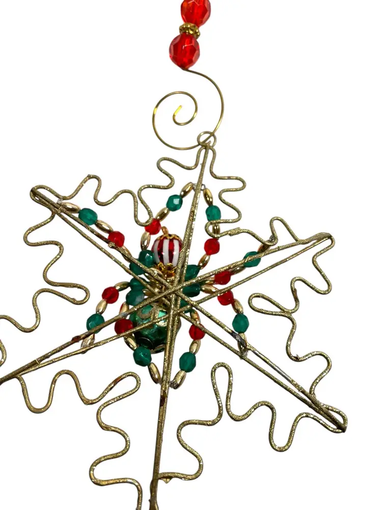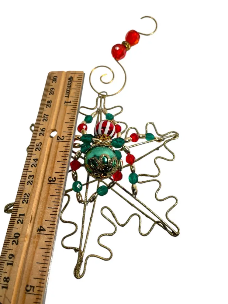 Made with old star shaped ornament. Beads from broken jewelry & new beads. Includes hanger. 4.5” x 4.5”.