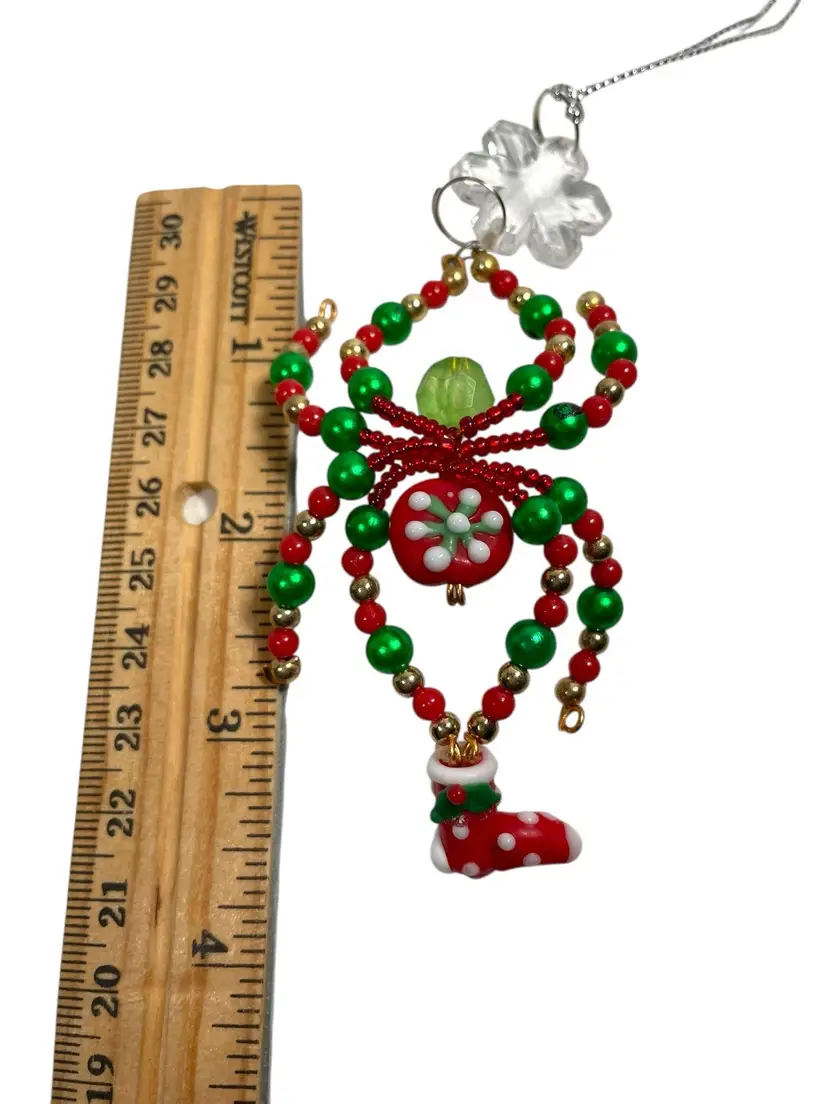 Made with new beads, holding lampwork glass stocking. Plastic snowflake. 3.25” x 2”.