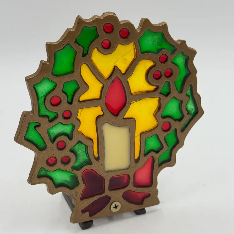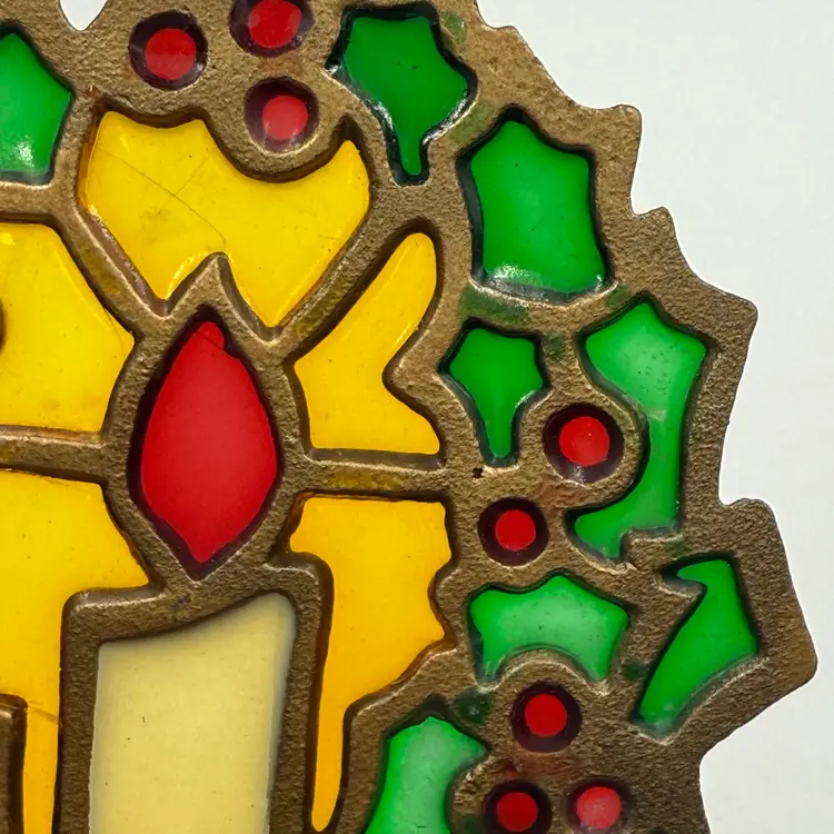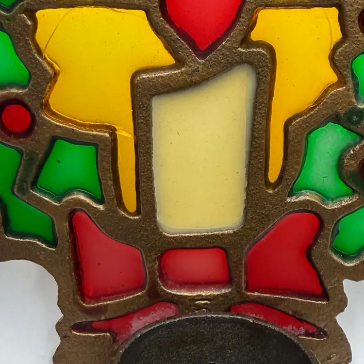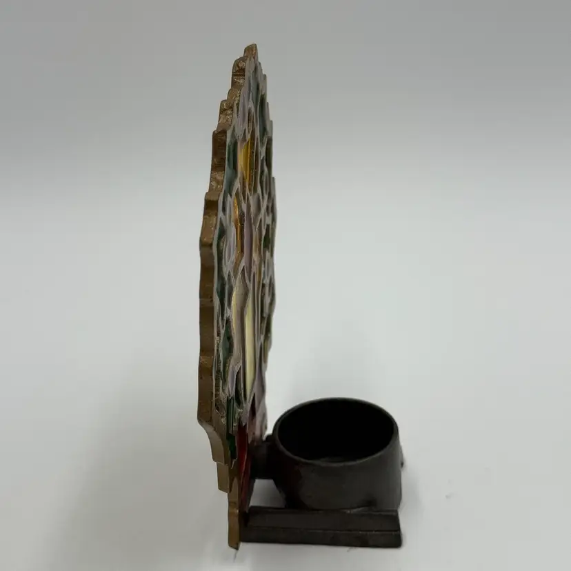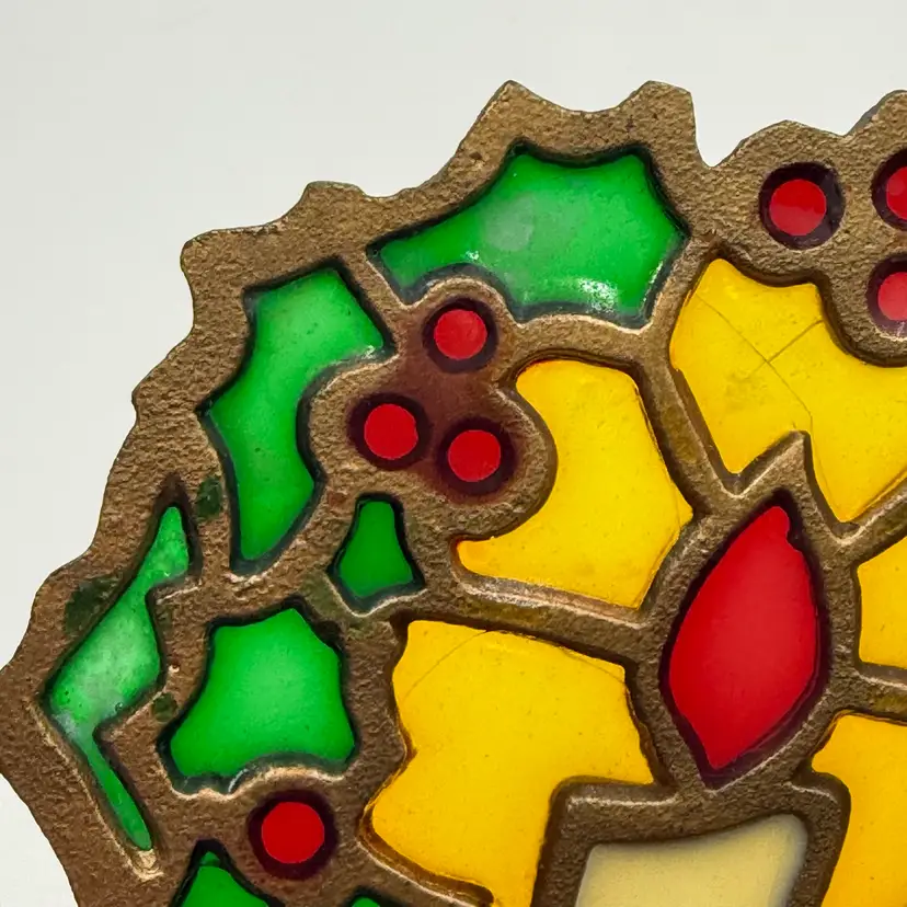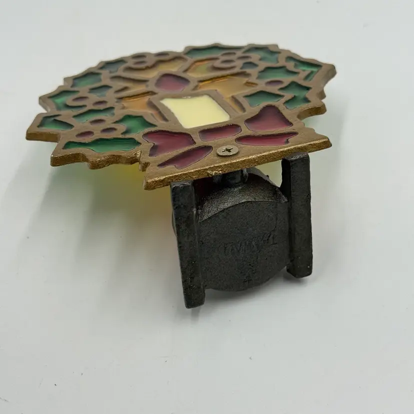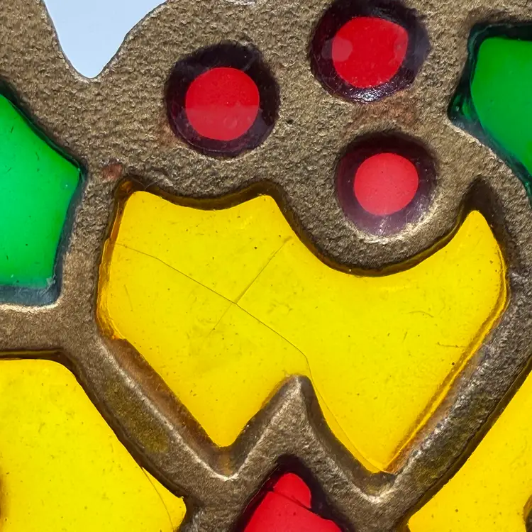 In fair condition. There are cracks on the yellow glass panels. Measures 6 inches tall and 5 1/2 inches wide.