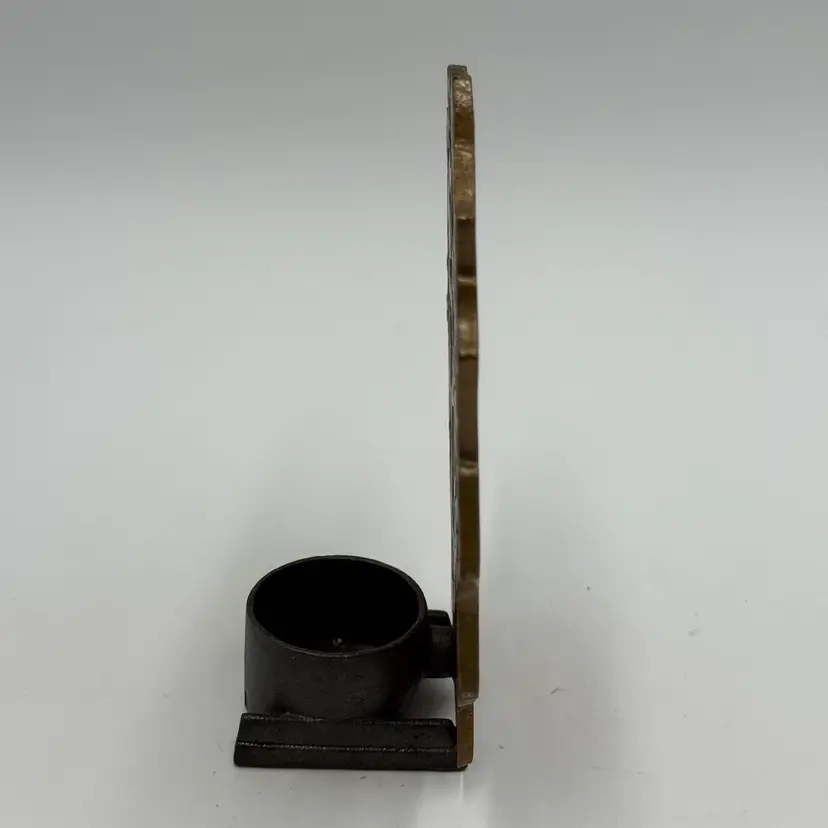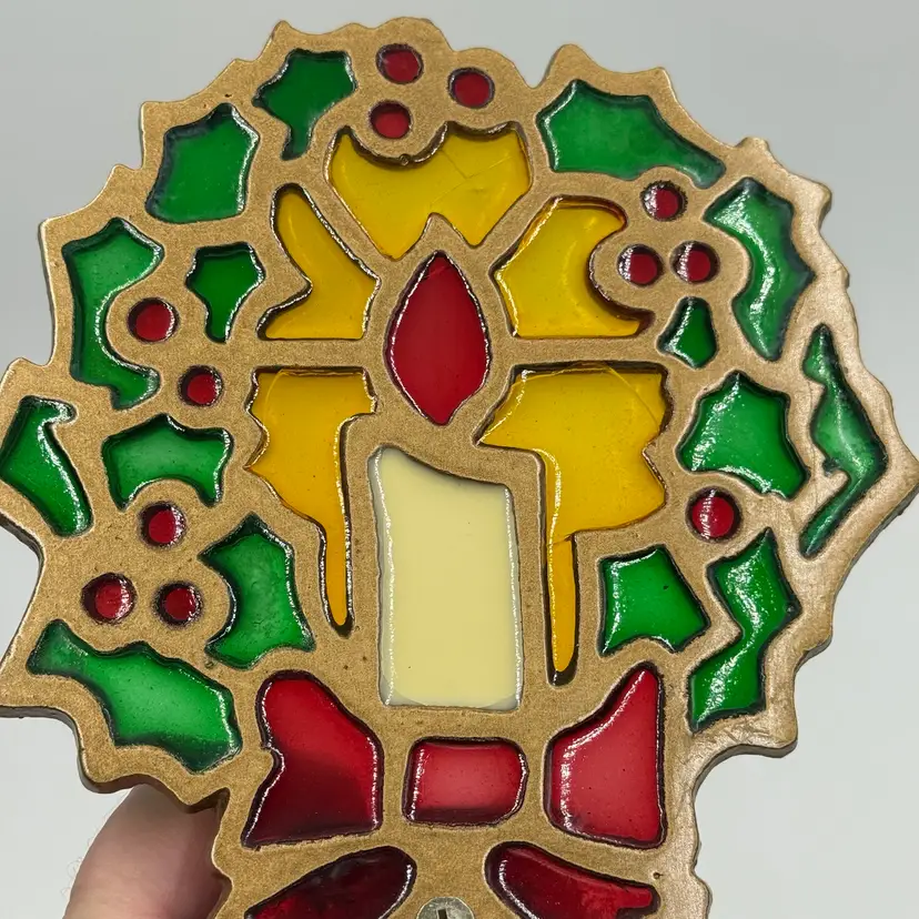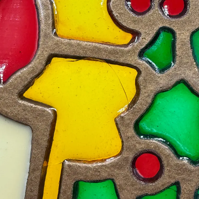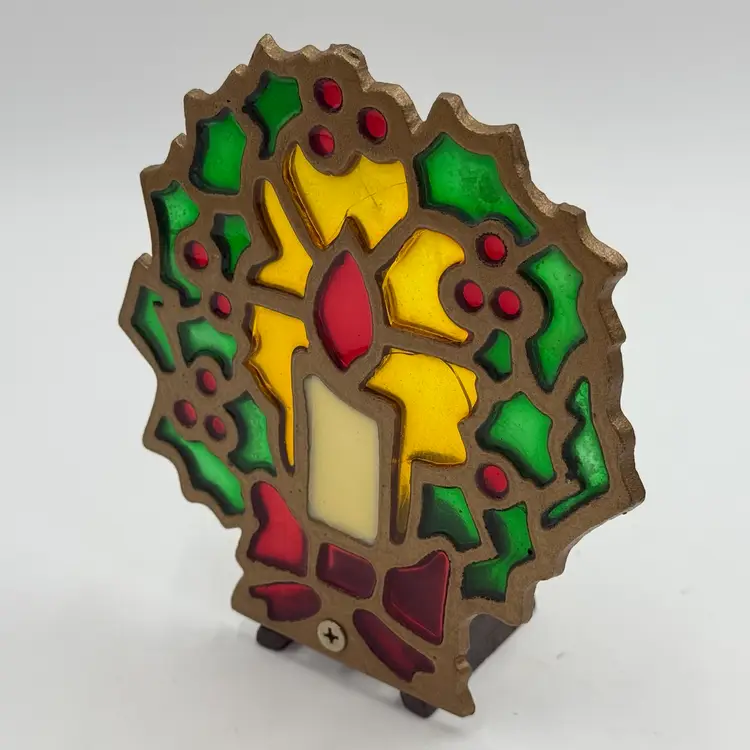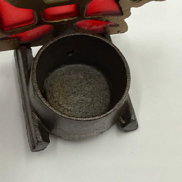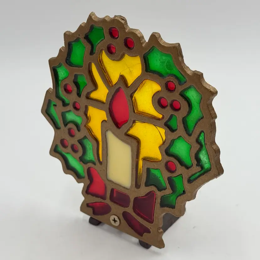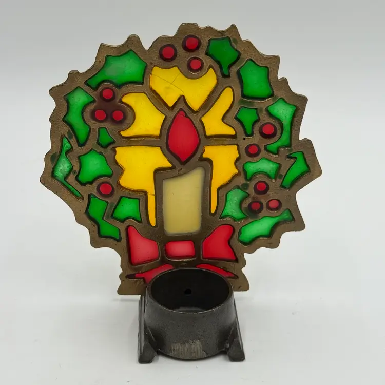 In fair condition. There are cracks on the yellow glass panels. Measures 6 inches tall and 5 1/2 inches wide.